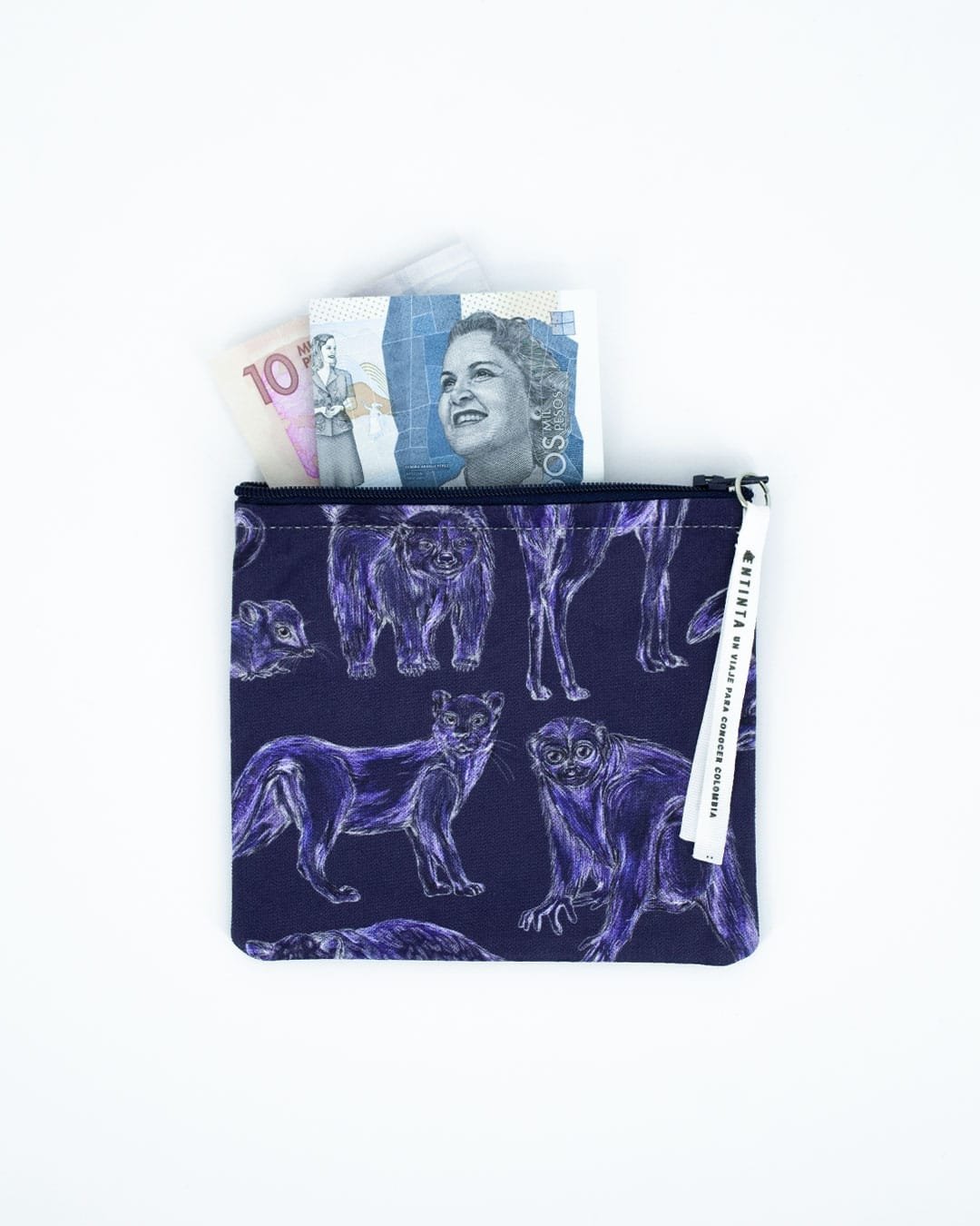 Monedero con nuestro estampado “Mamíferos de La Sierra, cuidadores de la armonía – Desde los más pequeños hasta los más grandes, los mamíferos de La Sierra son seres vivos y espirituales, autoridades y guardianes del territorio. Protegen y cuidan la conectividad de La Sierra participando en la dinámica natural de los ecosistemas.”.