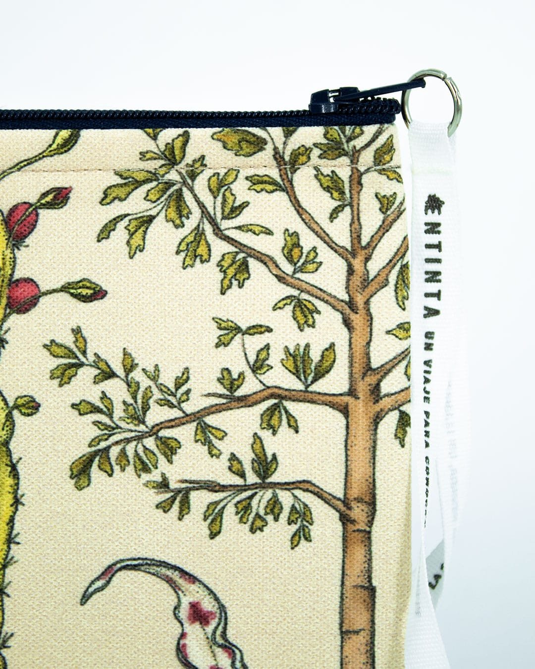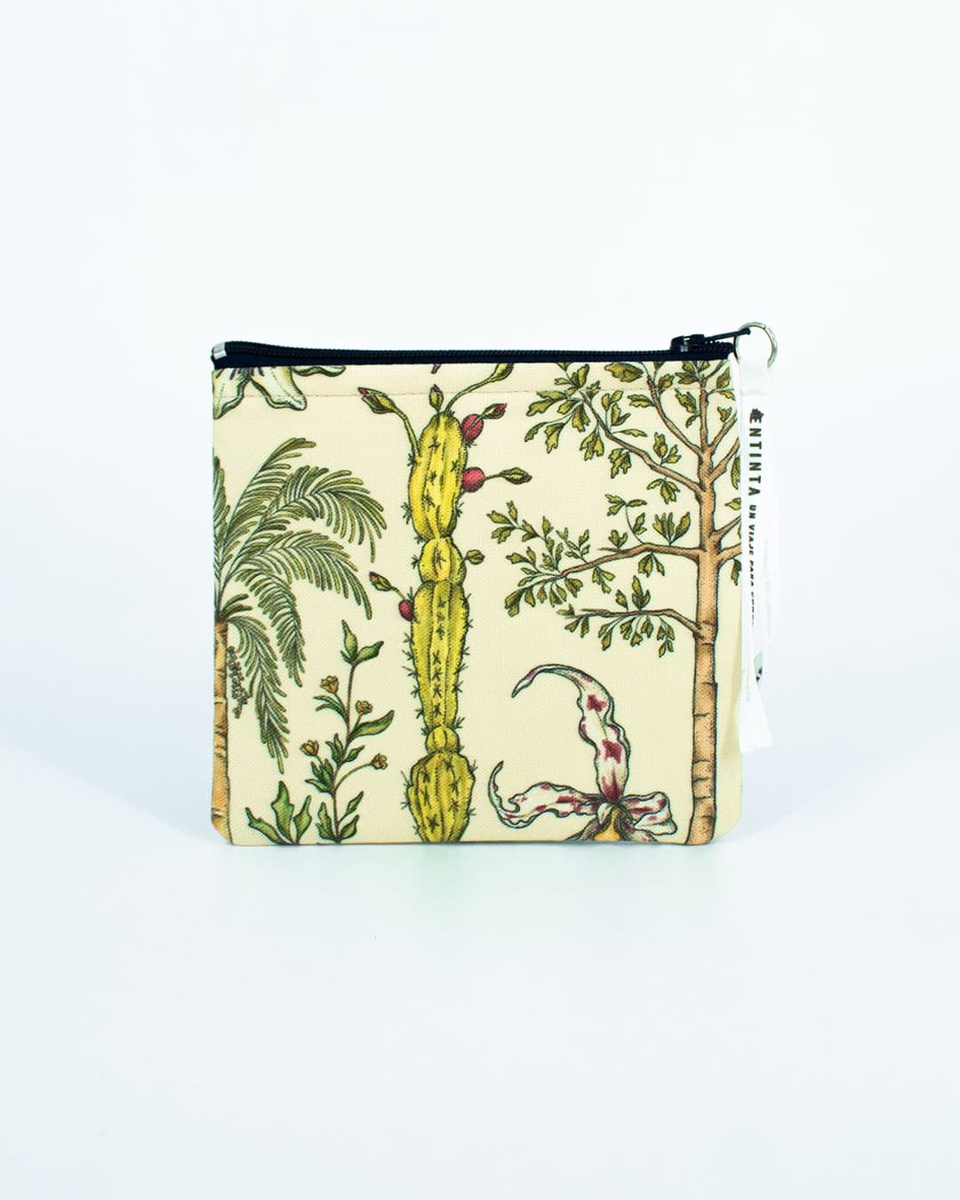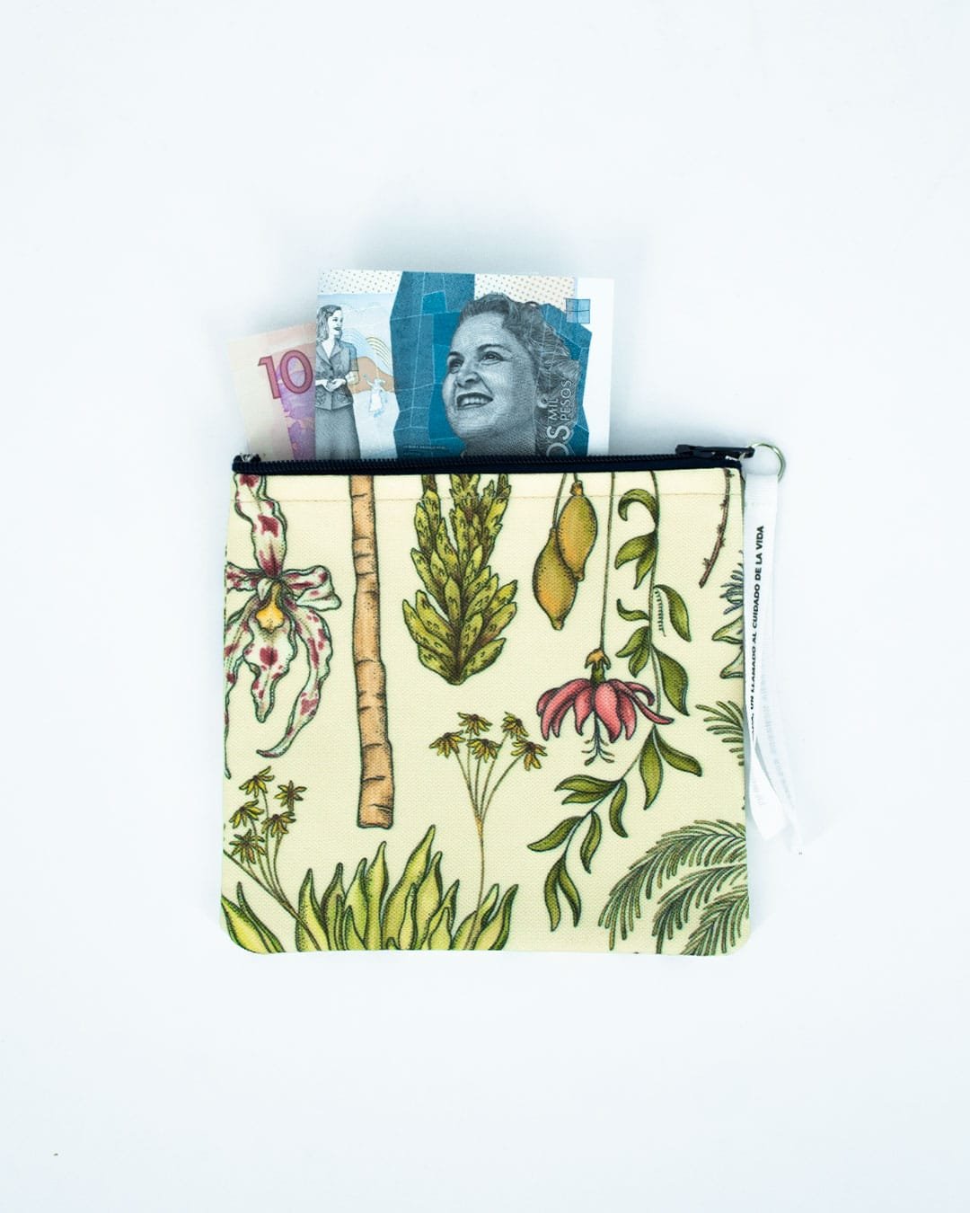 Monedero con nuestro estampado “Vegetación de La Sierra, heterogénea, relacional y vital – Un panorama de colores, tamaños y formas que cambia cada paso hacia arriba. Desde el mar caribe hasta los picos nevados, a cada planta de La Sierra se le asignó una función ecológica y espiritual que cumplir en el tejido de la vida. Hay plantas medicinales, comestibles, de uso ceremonial, para construir y tinturar.”.