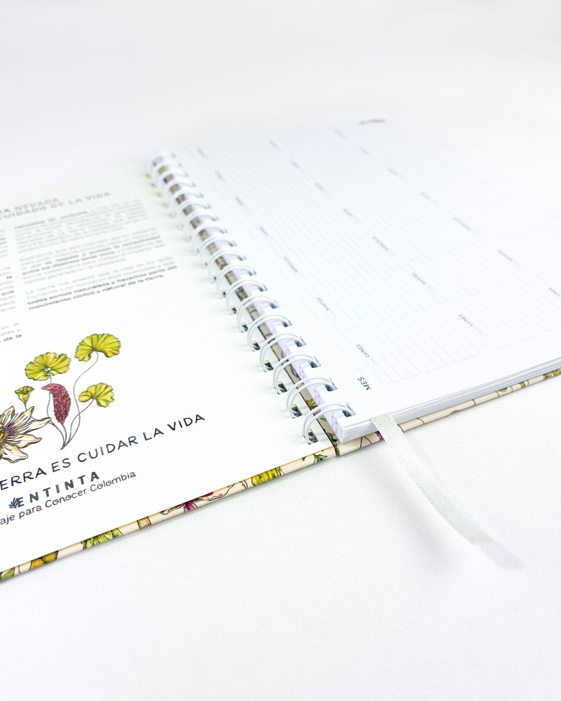 Planeador anual con nuestro estampado “Vegetación de La Sierra, heterogénea, relacional y vital – Un panorama de colores, tamaños y formas que cambia cada paso hacia arriba. Desde el mar caribe hasta los picos nevados, a cada planta de La Sierra se le asignó una función ecológica y espiritual que cumplir en el tejido de la vida. Hay plantas medicinales, comestibles, de uso ceremonial, para construir y tinturar.”.