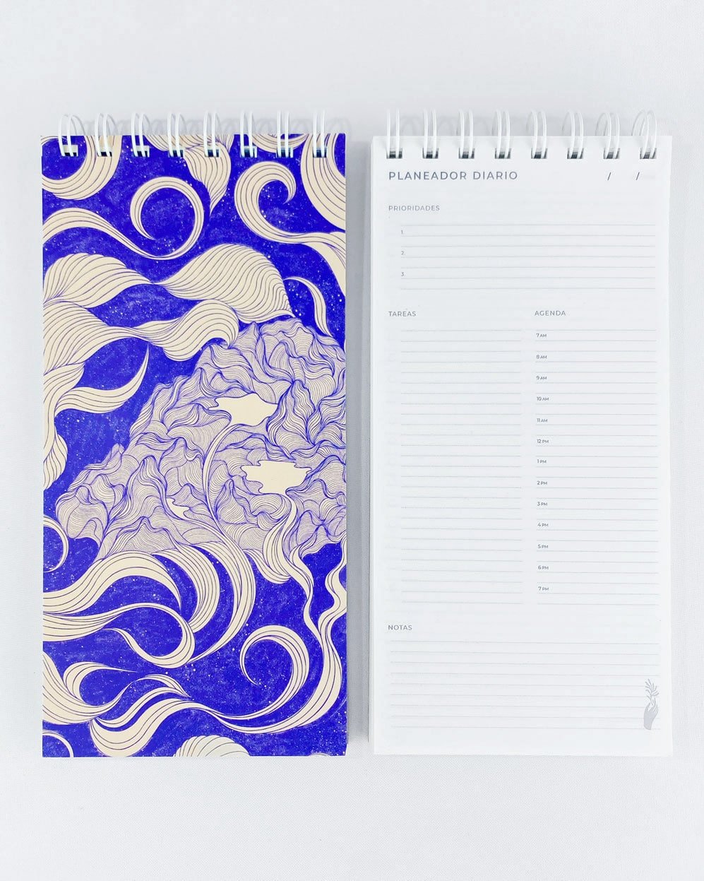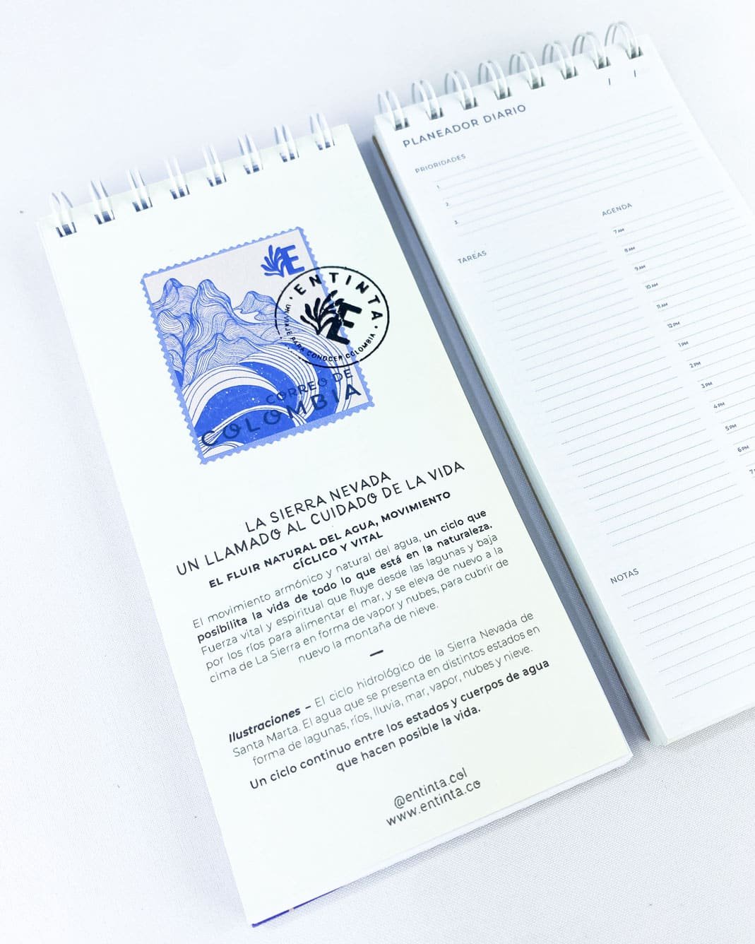 Planeador diario con nuestro estampado  El Fluir natural del Agua, movimiento cíclico y vital  El movimiento armónico y natural del agua, un ciclo que posibilita la vida de todo lo que está en la naturaleza. Fuerza vital y espiritual que fluye desde las lagunas y baja por los ríos para alimentar el mar, y se eleva de nuevo a la cima de La Sierra en forma de vapor y nubes, para cubrir de nuevo la montaña de nieve.”
