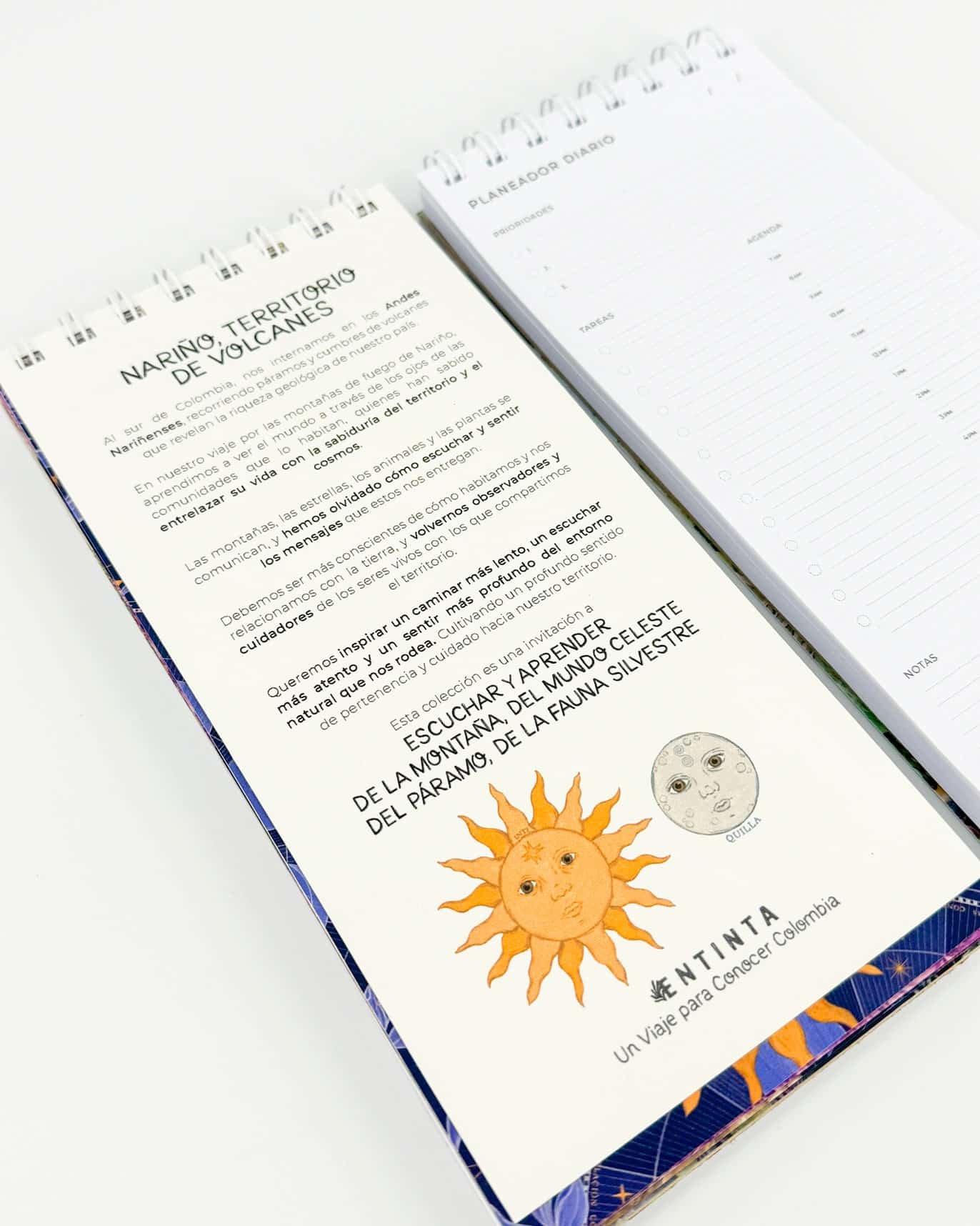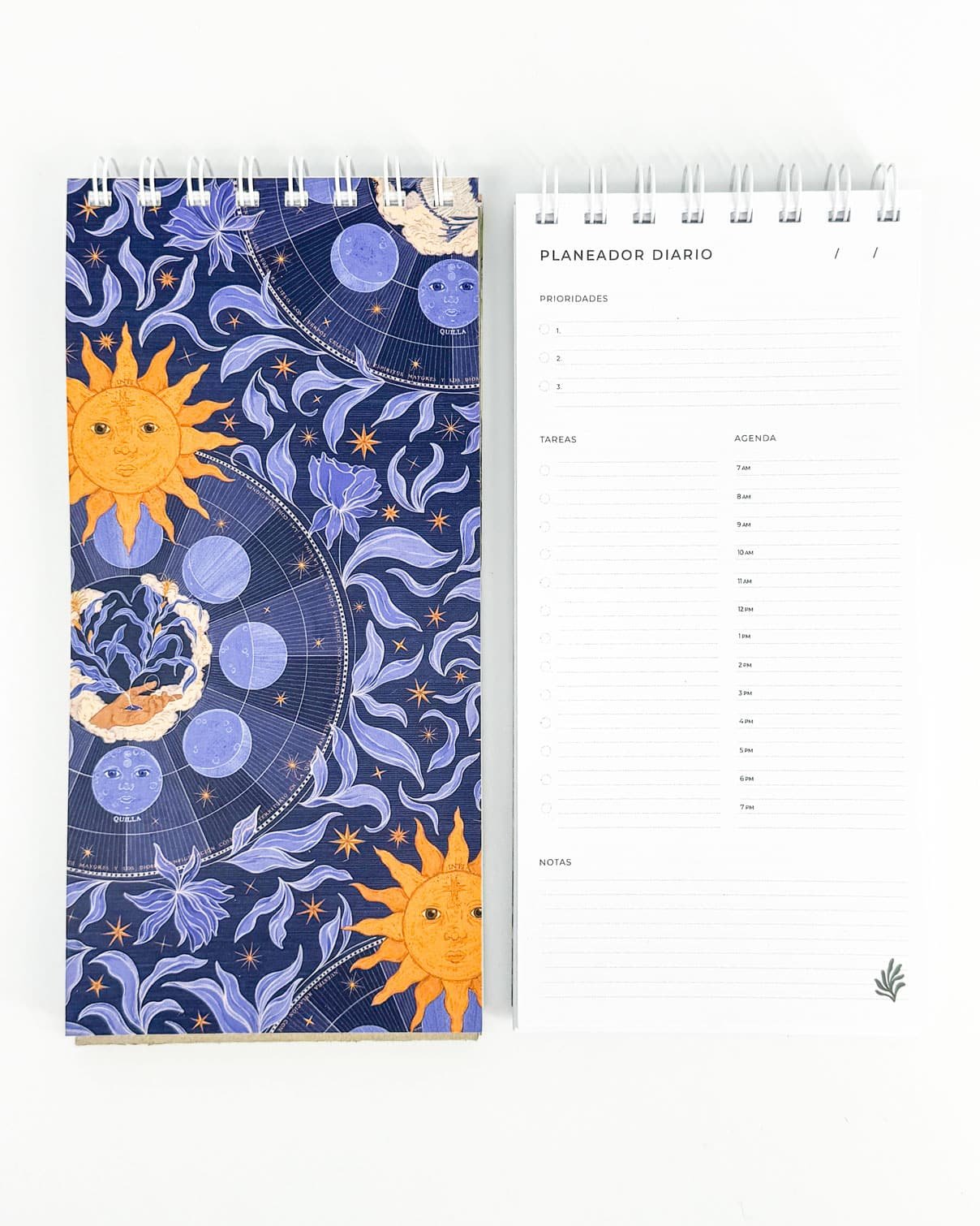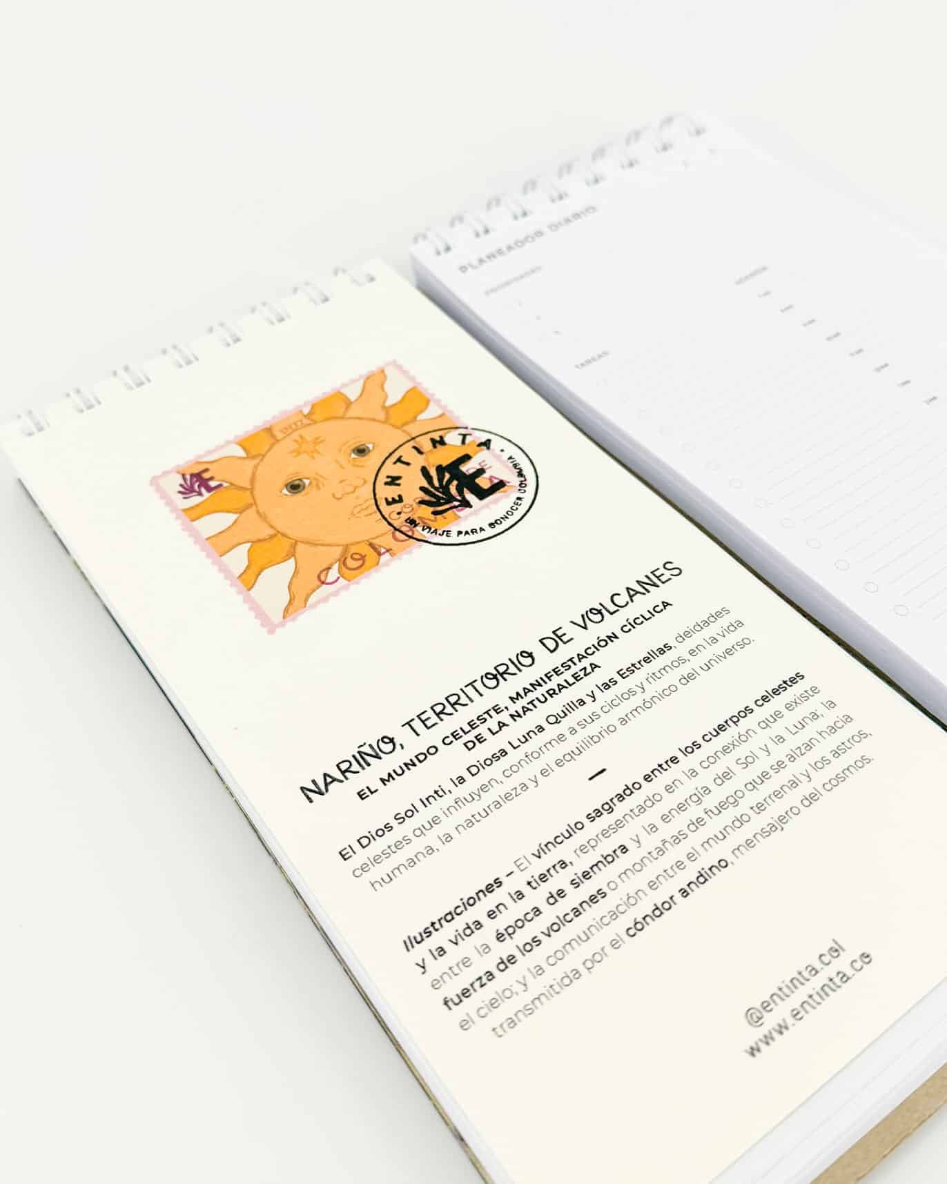 Planeador diario con nuestro estampado “El Mundo Celeste, manifestación cíclica de la naturaleza – El Dios Sol Inti, la Diosa Luna Quilla y las Estrellas, deidades celestes que influyen, conforme a sus ciclos y ritmos, en la vida humana, la naturaleza y el equilibrio armónico del universo.”