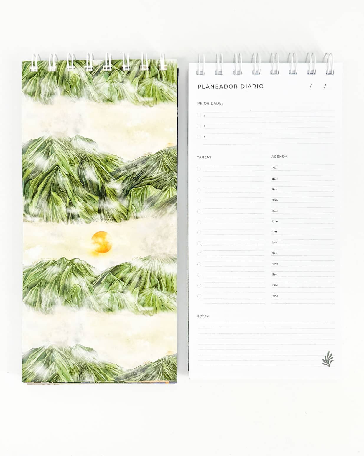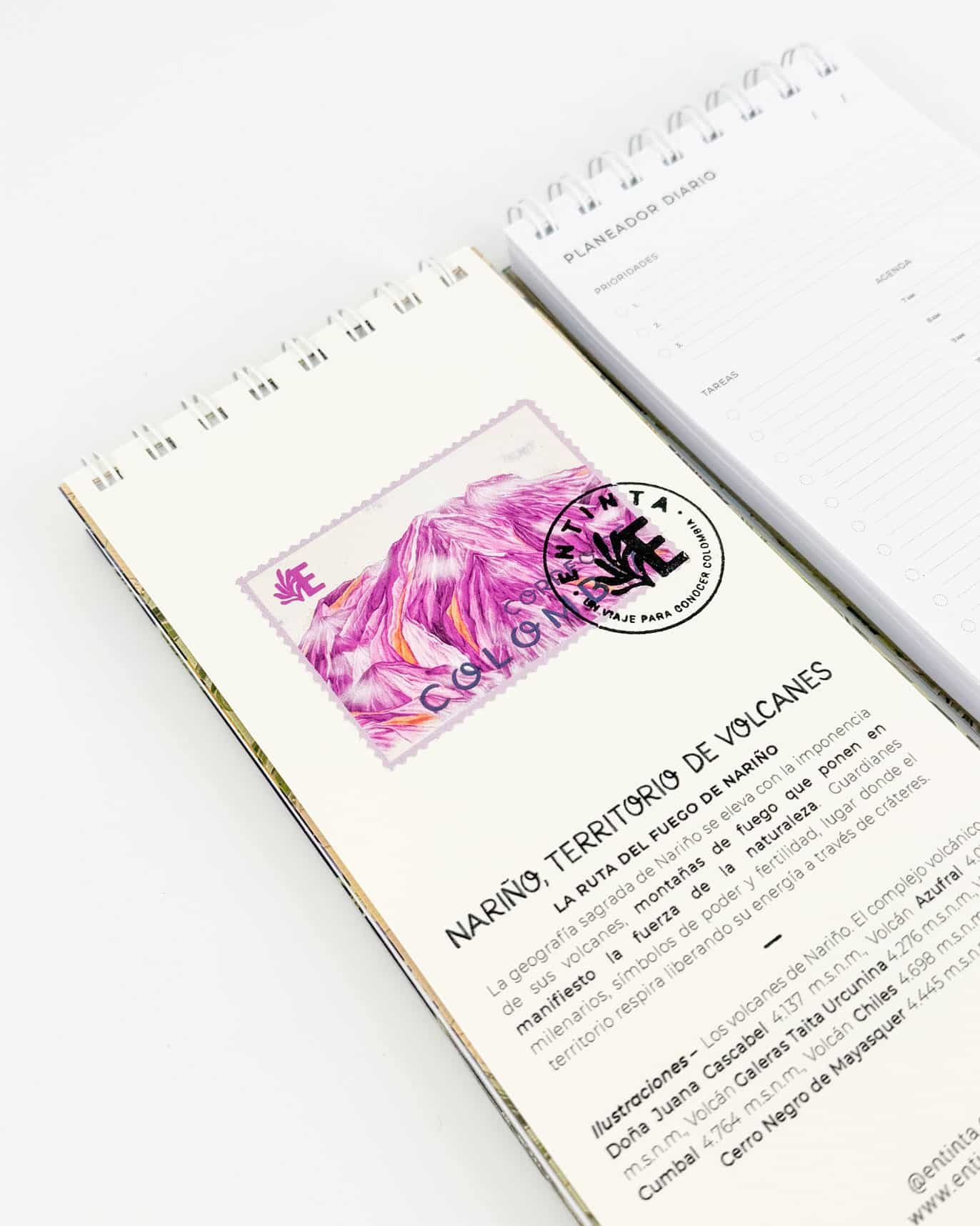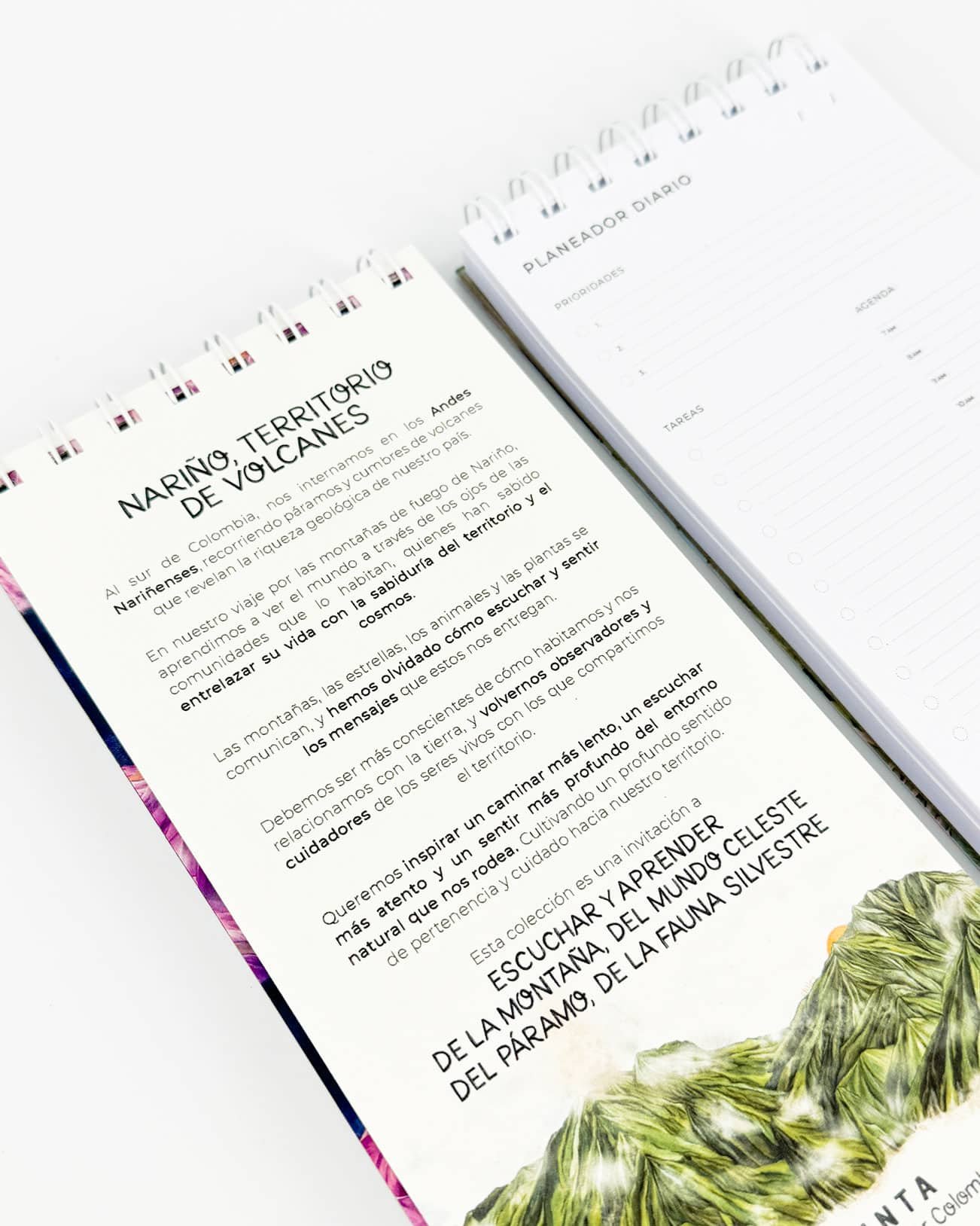 Planeador diario con nuestro estampado “La Ruta del Fuego de Nariño – La geografía sagrada de Nariño se eleva con la imponencia de sus volcanes, montañas de fuego que ponen en manifiesto la fuerza de la naturaleza. Guardianes milenarios, símbolos de poder y fertili