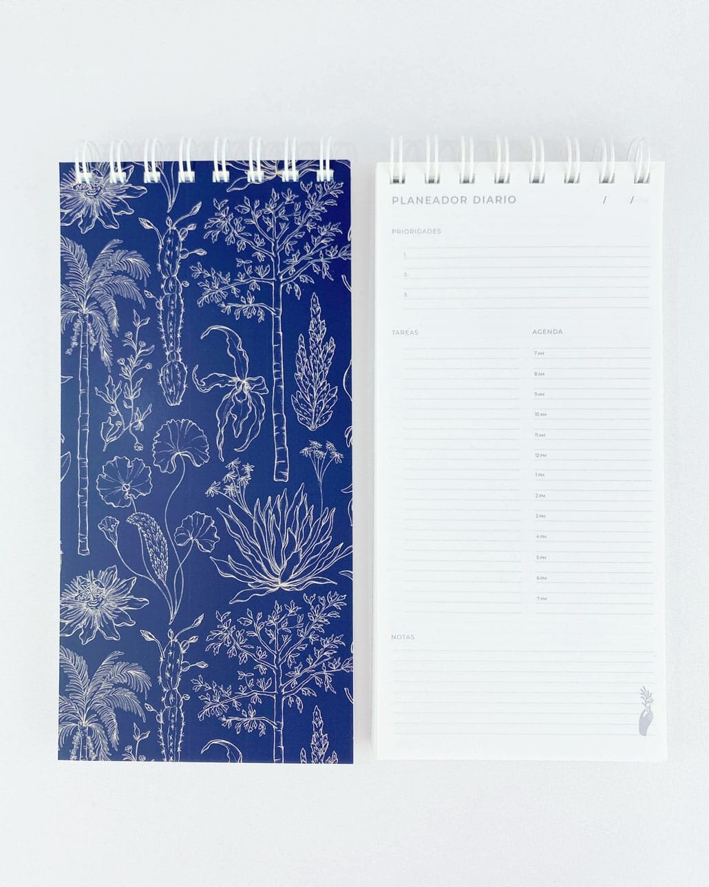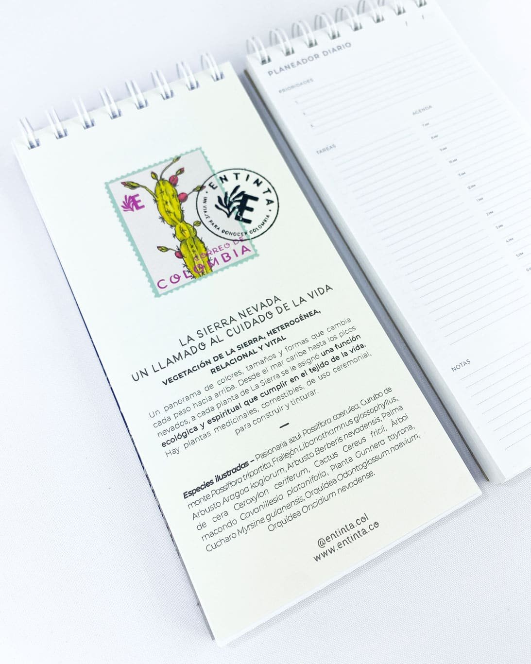 Planeador diario con nuestro estampado “Vegetación de La Sierra, heterogénea, relacional y vital – Un panorama de colores, tamaños y formas que cambia cada paso hacia arriba. Desde el mar caribe hasta los picos nevados, a cada planta de La Sierra se le asignó una función ecológica y espiritual que cumplir en el tejido de la vida. Hay plantas medicinales, comestibles, de uso ceremonial, para construir y tinturar.”.