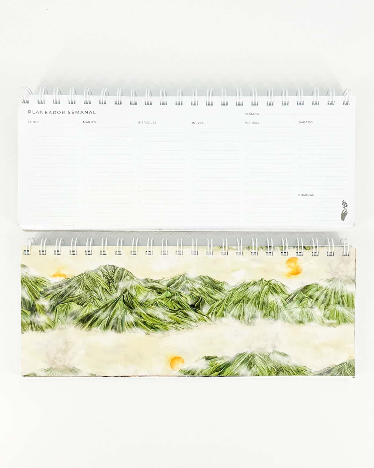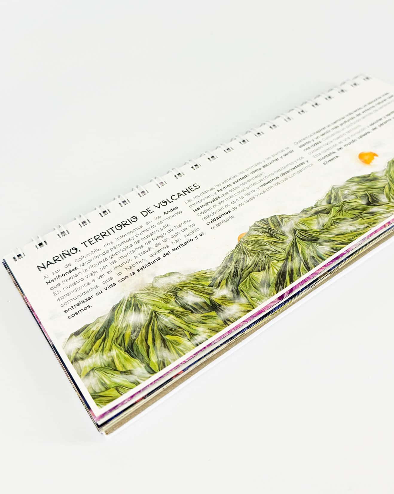 Planeador semanal con nuestro estampado “El Páramo de los Andes Nariñenses – En la inmensidad de estas tierras frías, las nubes se funden con las montañas, creando un ecosistema mágico, envuelto en misterio, quietud y neblina. Hogar de frailejones, pajonales y fauna, que ocultos tras la bruma, cuidan y protegen el agua.”