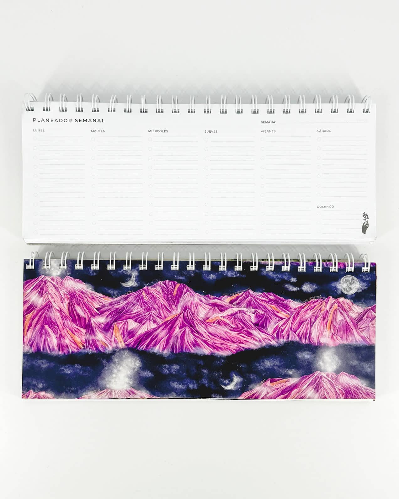 Planeador semanal con nuestro estampado “El Páramo de los Andes Nariñenses – En la inmensidad de estas tierras frías, las nubes se funden con las montañas, creando un ecosistema mágico, envuelto en misterio, quietud y neblina. Hogar de frailejones, pajonales y fauna, que ocultos tras la bruma, cuidan y protegen el agua.”