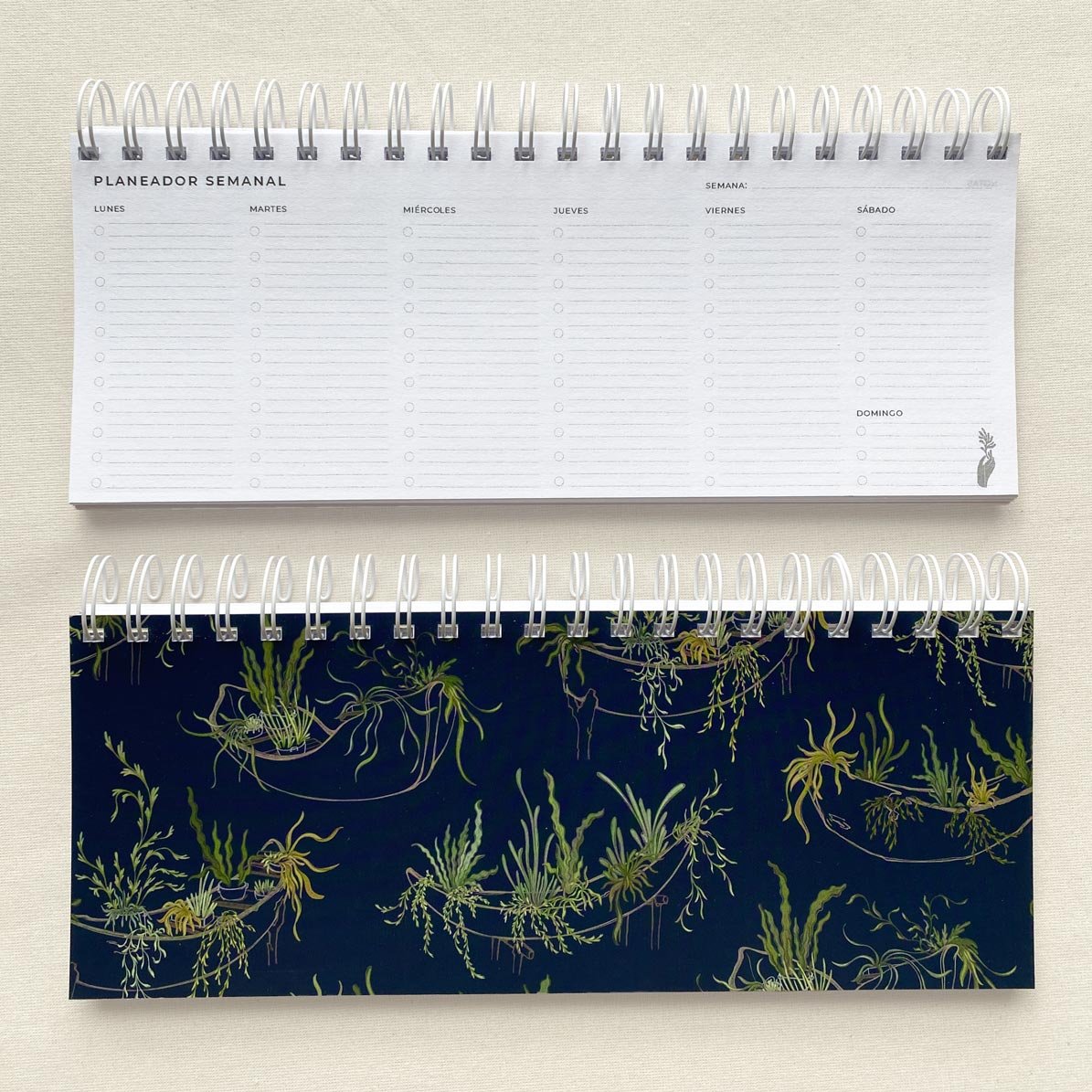 Planeador semanal con nuestro estampado “Zoteas, refugio de saberes y sabores – Canoas que pierden su capacidad de navegar y se convierten en un lugar de cultivo de plantas tradicionales empleadas en la gastronomía y medicina del Pacífico”.