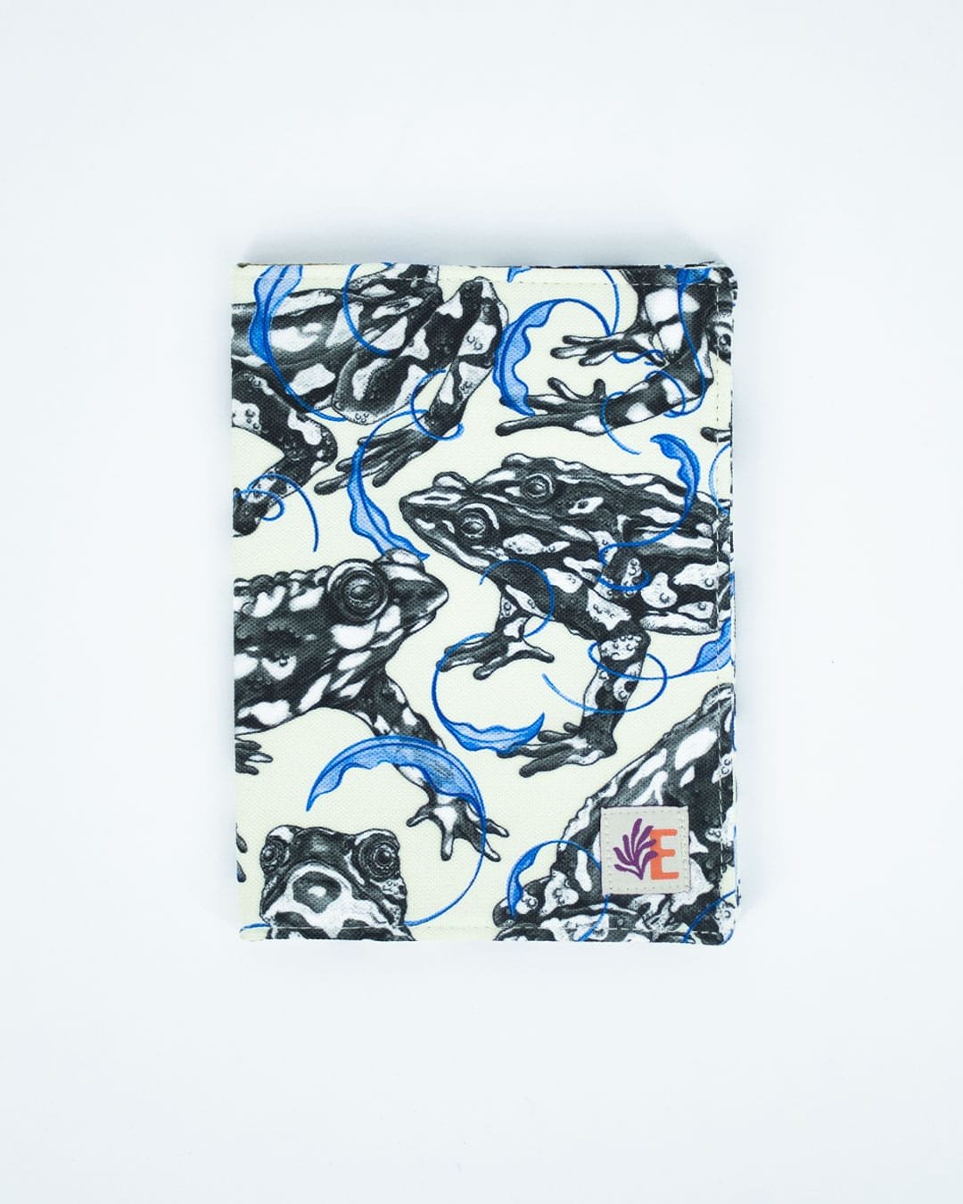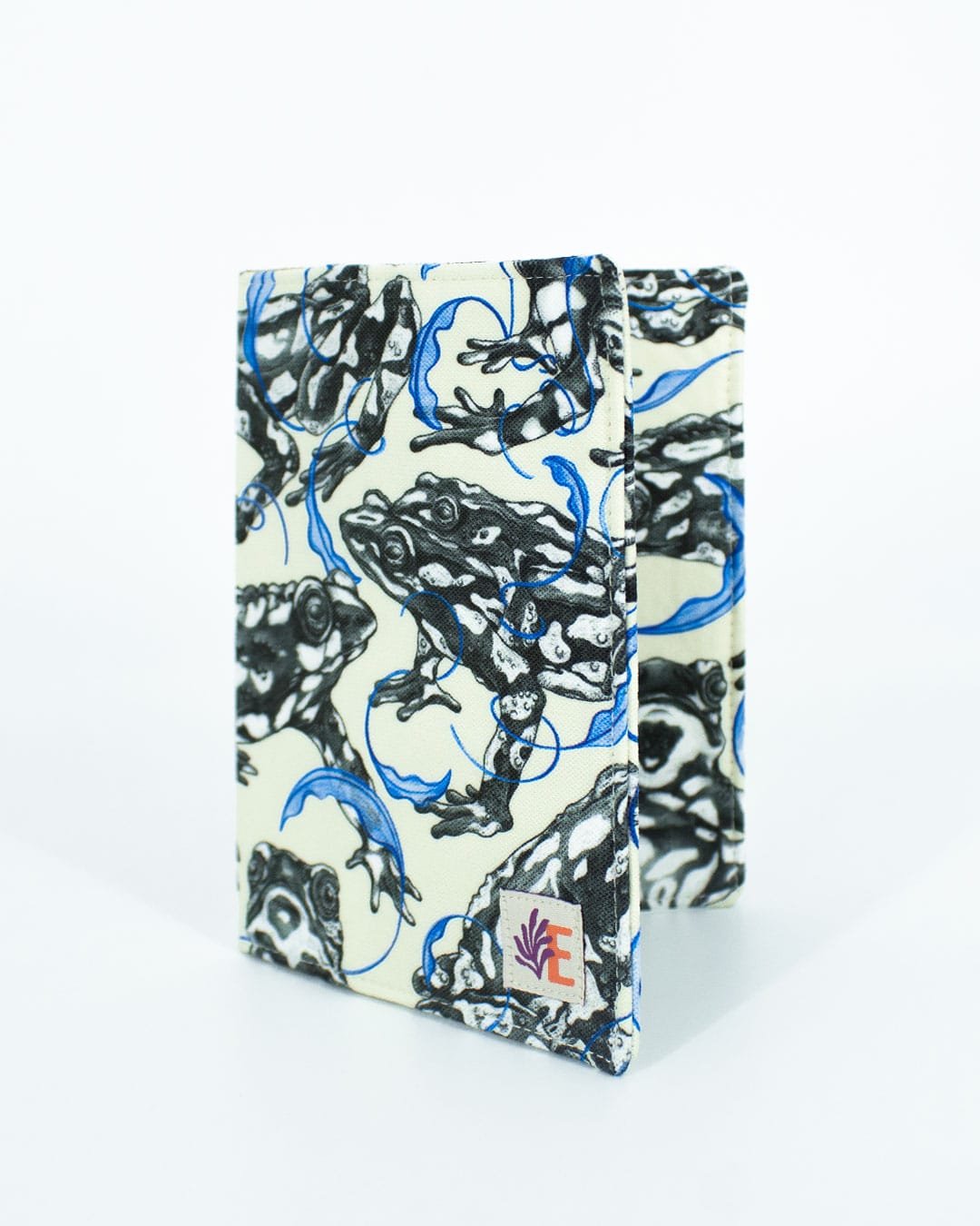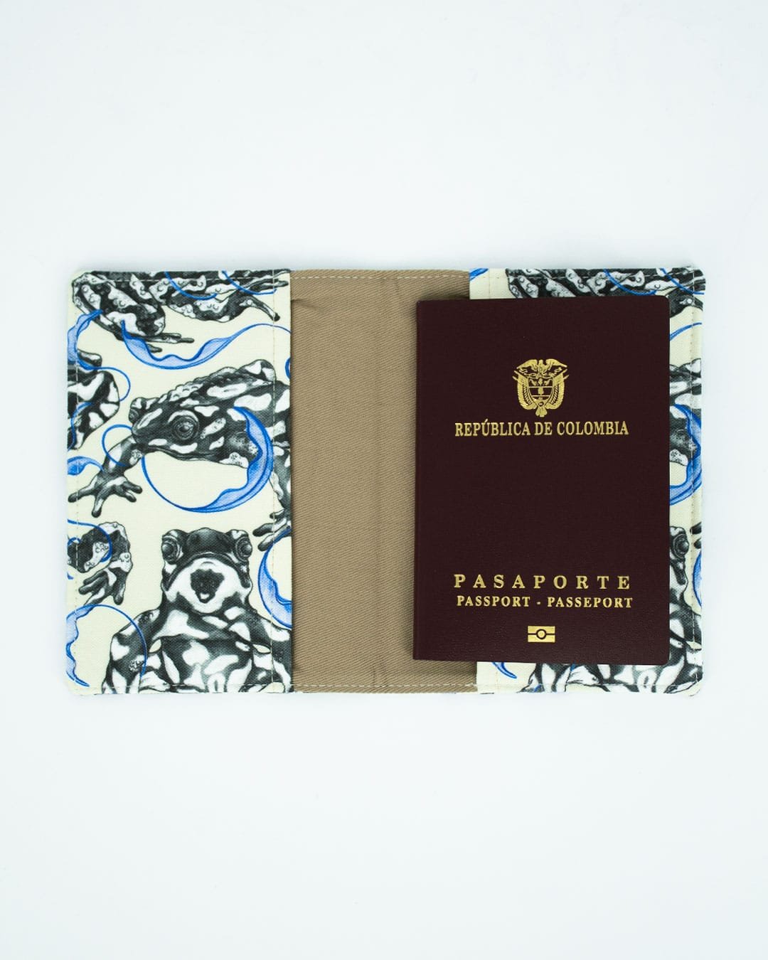 Porta pasaporte con nuestro estampado “Arlequines de la Noche Estrellada, guardianas del Agua – Autoridades protectoras de La Sierra Nevada de Santa Marta, símbolo de fertilidad y salud del ecosistema. En coro le cantan a la madre agua y avisan que ya se puede sembrar el alimento..”.