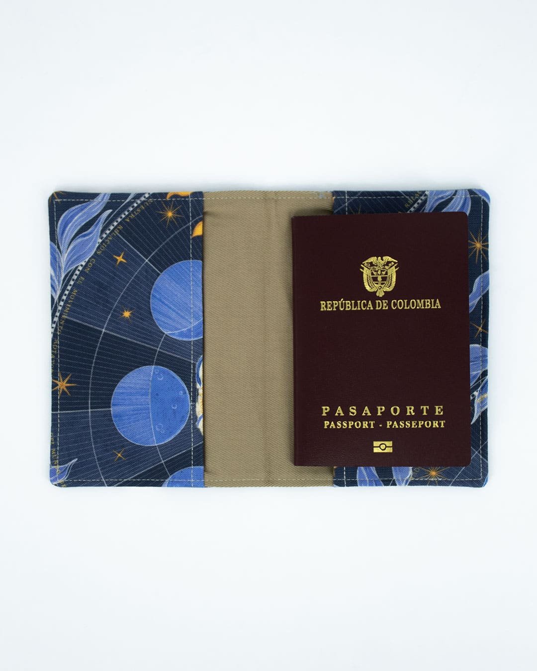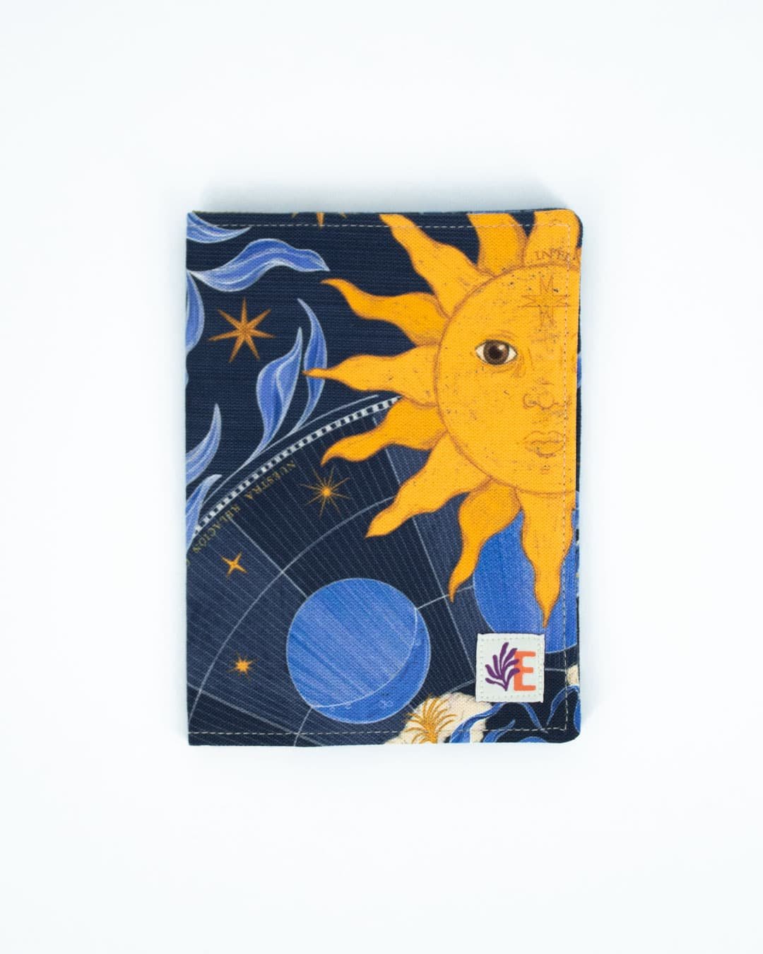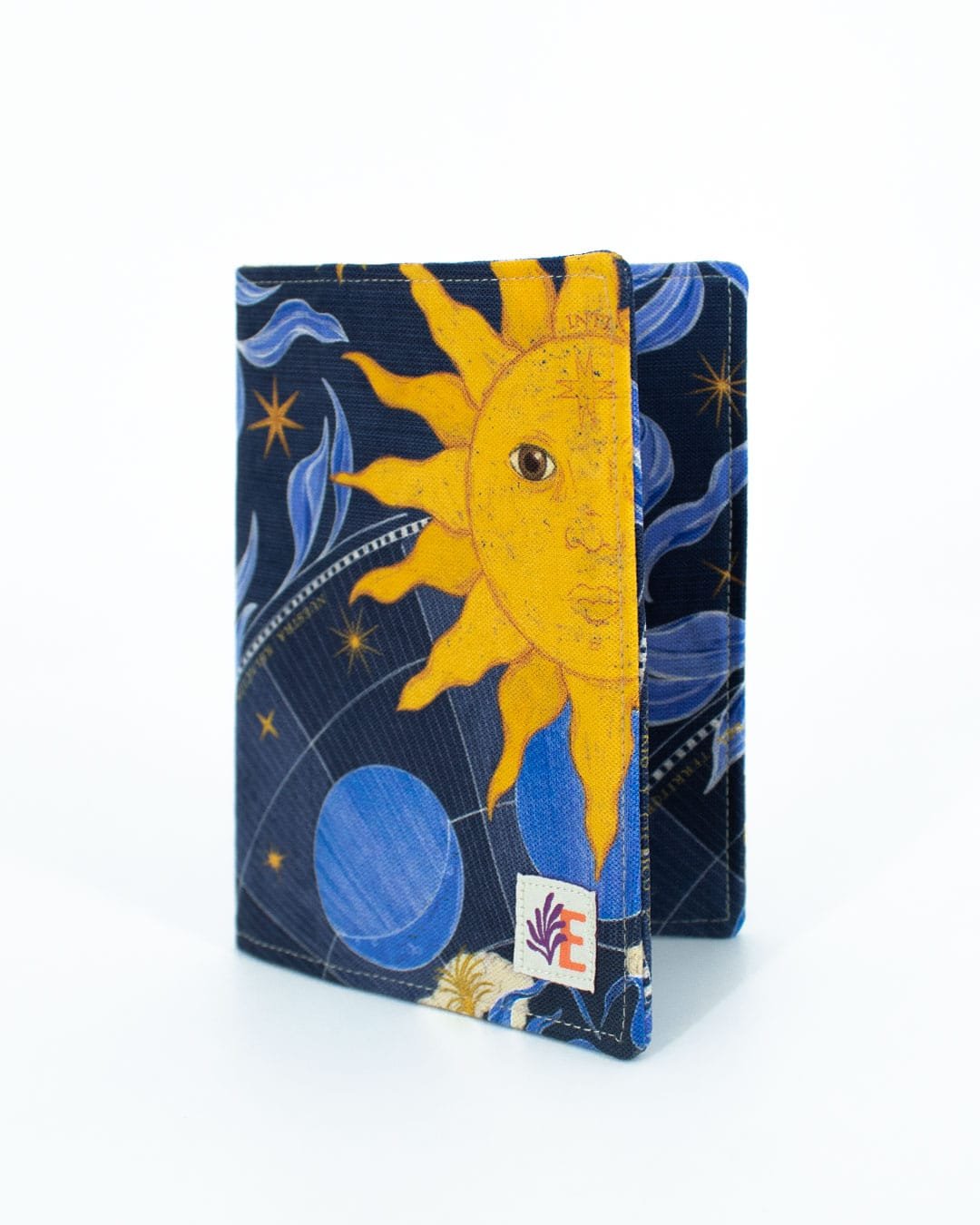 Porta pasaporte con nuestro estampadoEl Mundo Celeste, manifestación cíclica de la naturaleza – El Dios Sol Inti, la Diosa Luna Quilla y las Estrellas, deidades celestes que influyen, conforme a sus ciclos y ritmos, en la vida humana, la naturaleza y el equilibrio armónico del universo.