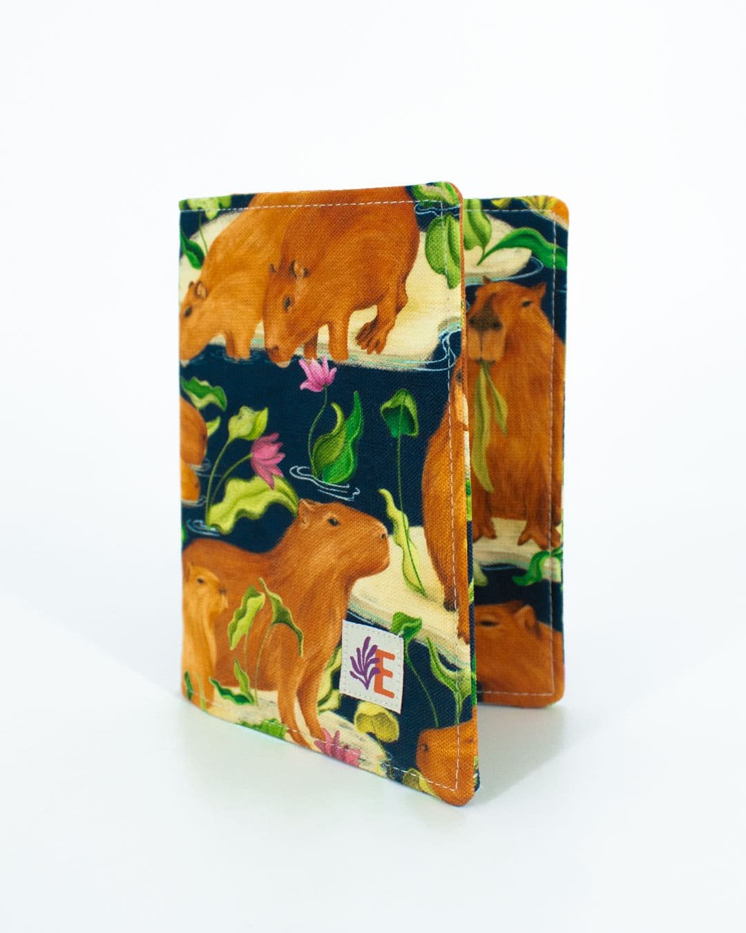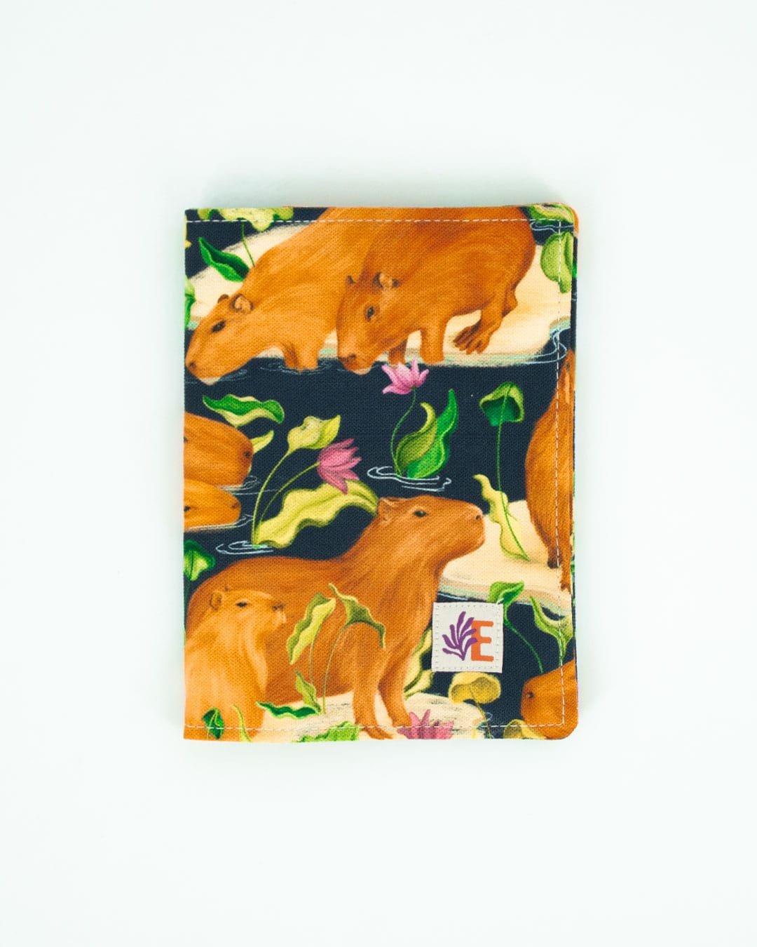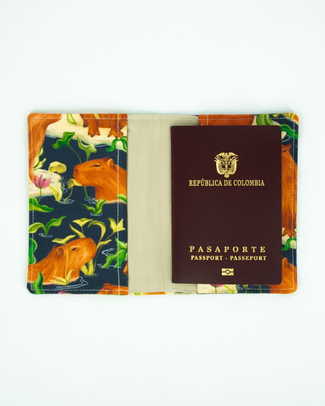 Porta pasaporte con nuestro estampado Esteros y Chigüiros, Paisaje Vivo – Los esteros, mantos de agua en medio de las praderas del llano. Un ecosistema vivo y diverso en el que habitan manadas de chigüiros que disfrutan de los lodazales y plantas del entorno”.