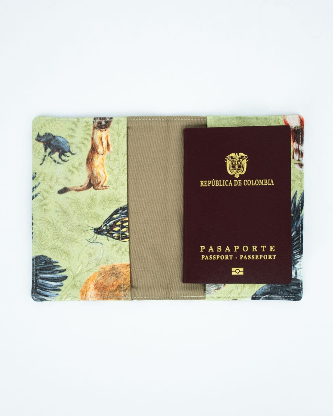Porta pasaporte con nuestro estampado  Fauna Silvestre en las Montañas de FuegoSeres de la naturaleza que habitan y protegen las montañas de Nariño. Cobijados por la fuerza de la montaña accionan en conjunto por el bienestar de la tierra y la red de vida que conforma el territorio.