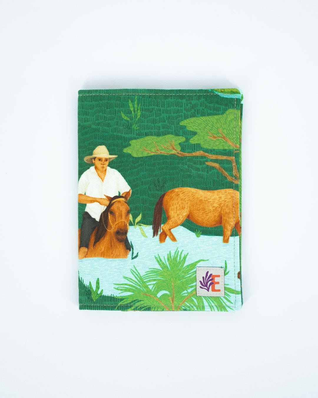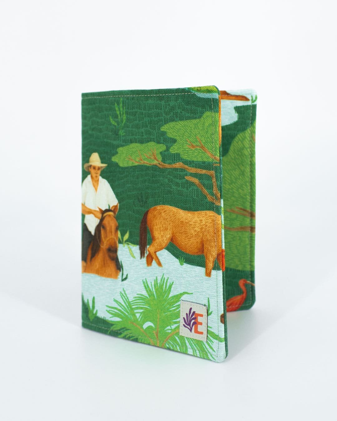 Porta pasaporte con nuestro estampado “Los Hatos, Paraísos de Vida – Internándose en las sabanas, el llanero a caballo recorre el Hato, una tierra que cuida y ama. Un ecosistema natural y cultural donde todos sus seres vivos coexisten de forma mutuamente enriquecedora”.