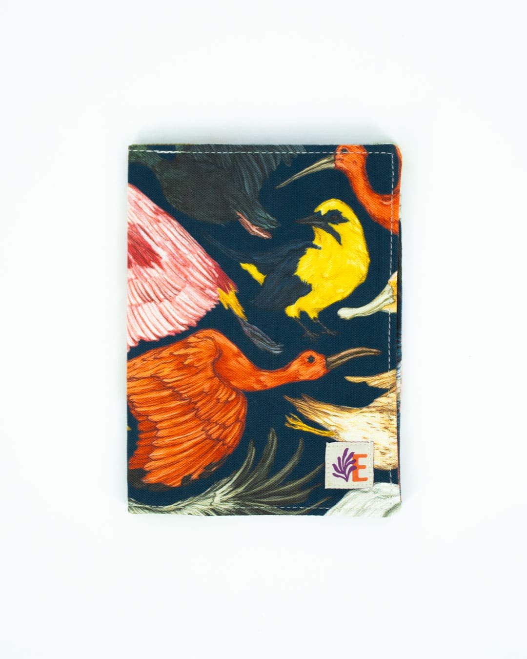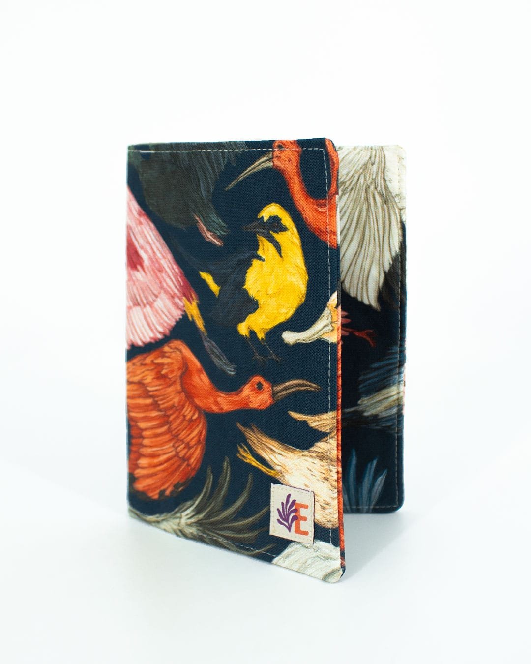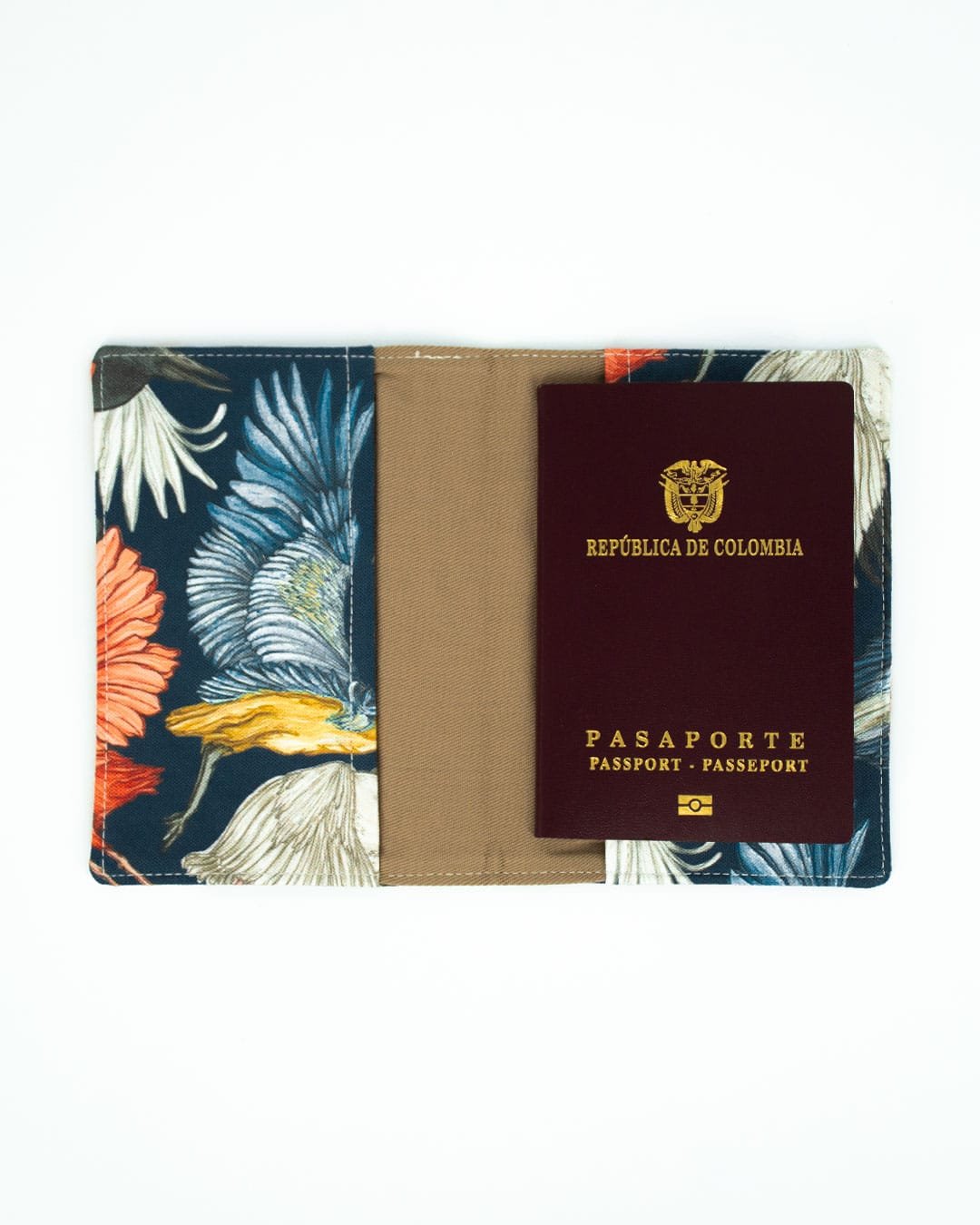 Porta pasaporte con nuestro estampado “Tierra de Aves, Diversidad de Vida y Color – Bandas de aves florecen el cielo de tonos infinitos con sus vistosos plumajes. Un espectáculo natural de color y diversidad que hace parte de la vida, cantos y cuentos del llano”.