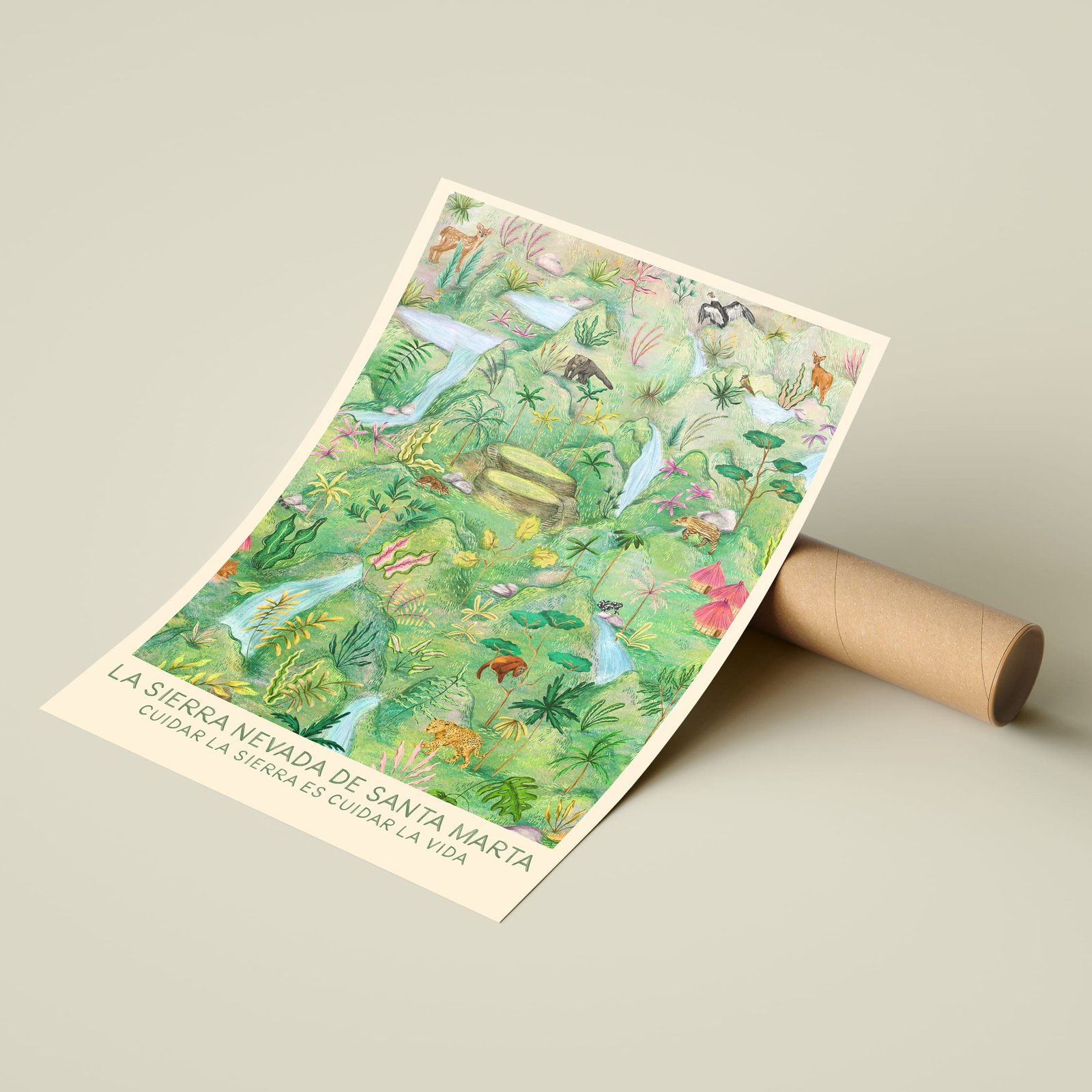 Póster con ilustración inspirada en La Sierra Nevada de Santa Marta, un territorio único donde convergen selva, montaña y mar.