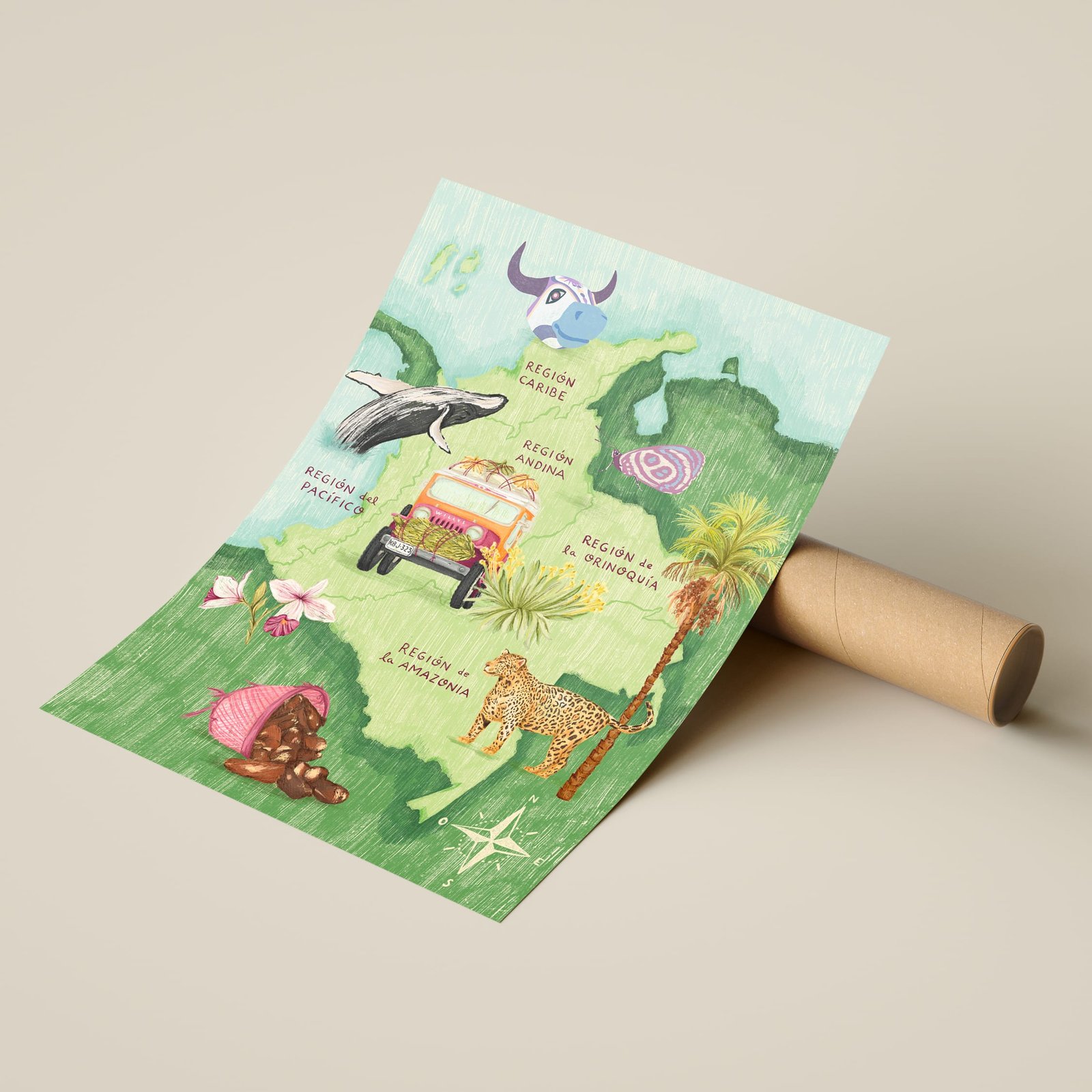 Póster con ilustración inspirada en Las regiones de Colombia, caribe, andina, pacífico, orinoquía y amazonia.