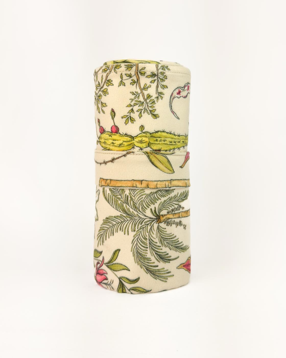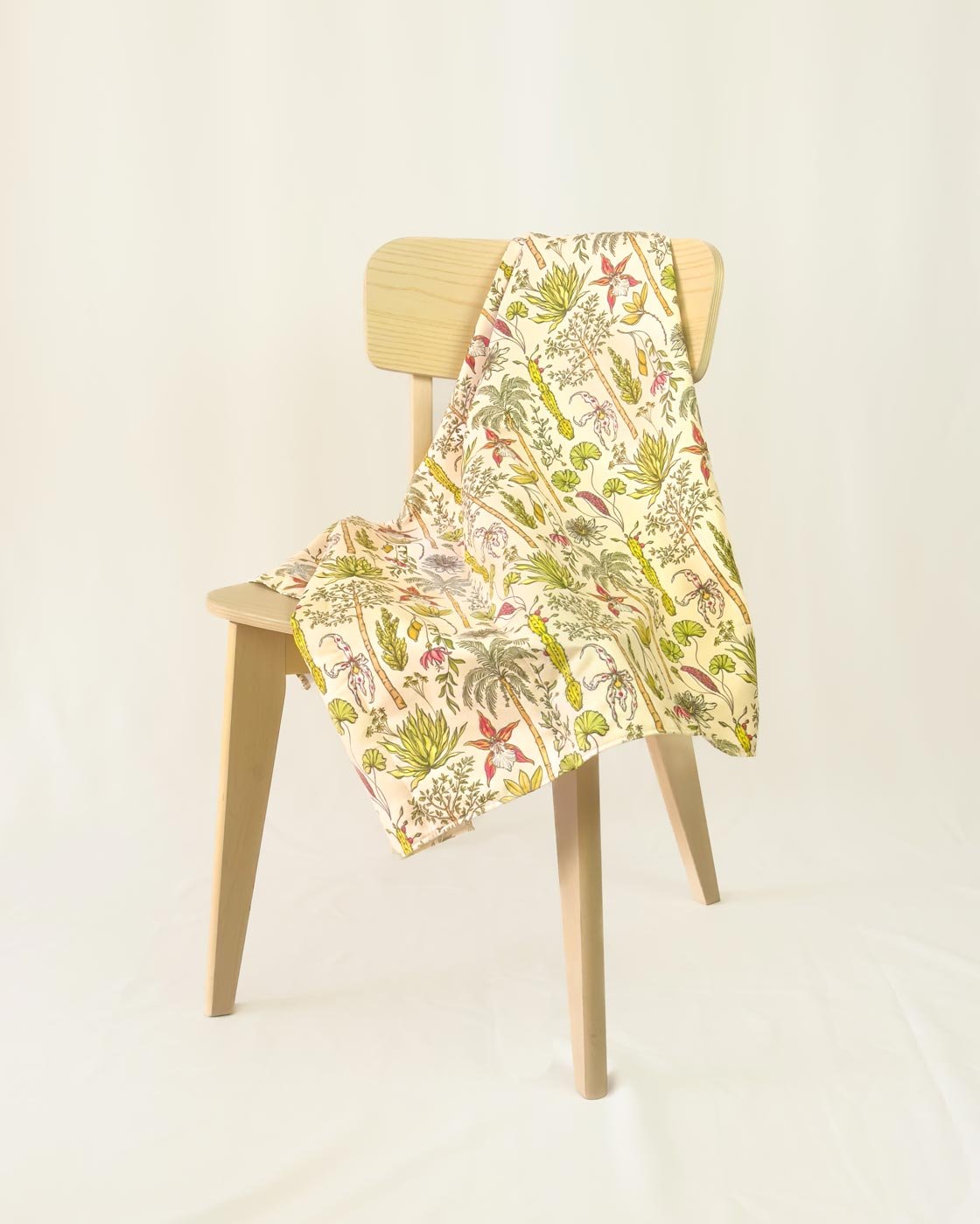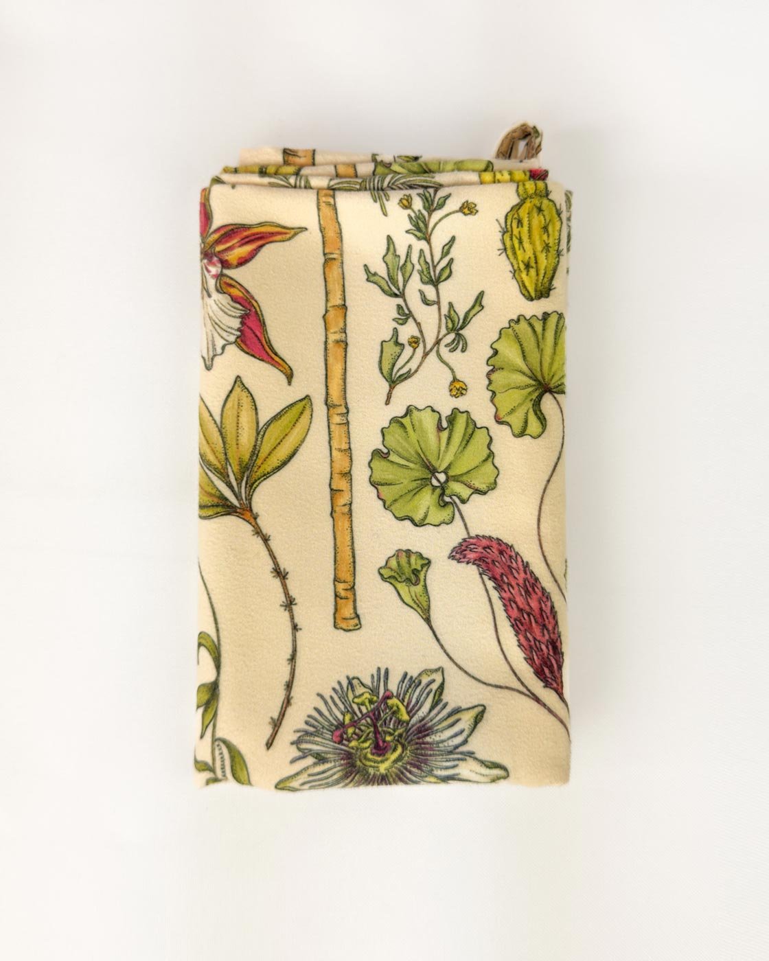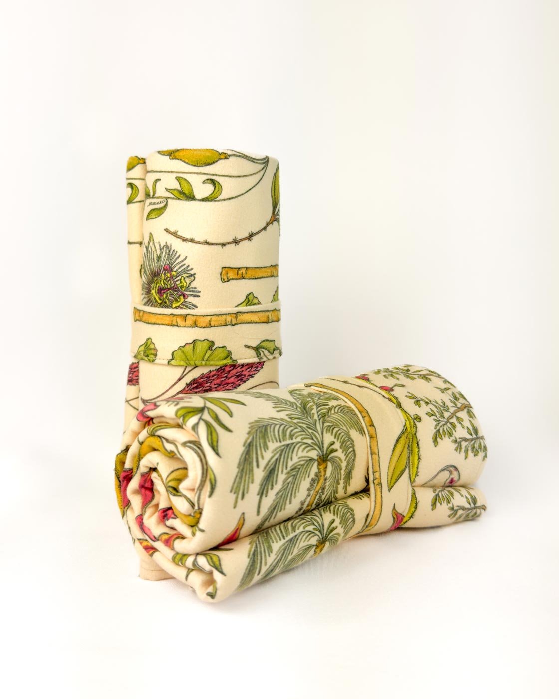 Vienen con nuestro estampado “Vegetación de La Sierra, heterogénea, relacional y vital – Un panorama de colores, tamaños y formas que cambia cada paso hacia arriba. Desde el mar caribe hasta los picos nevados, a cada planta de La Sierra se le asignó una función ecológica y espiritual que cumplir en el tejido de la vida. Hay plantas medicinales, comestibles, de uso ceremonial, para construir y tinturar.”. Un diseño inspirado en nuestro viaje a Ciudad Perdida en el departamento de Magdalena para la colección La Sierra Nevada, un llamado al cuidado de la Vida.