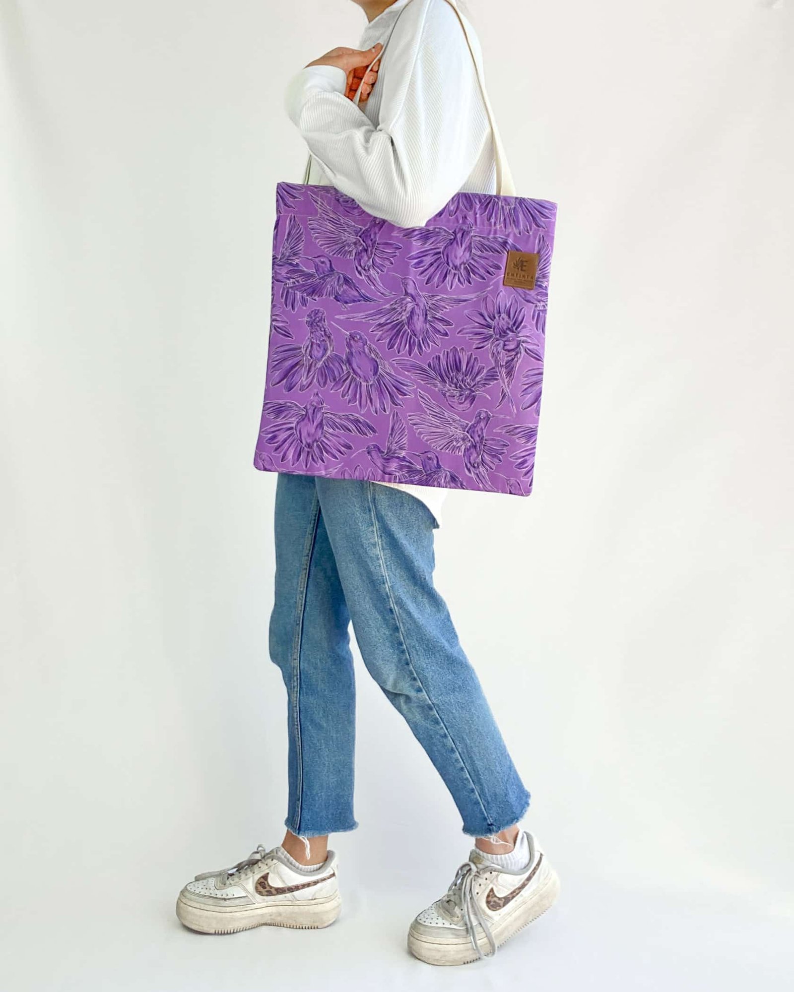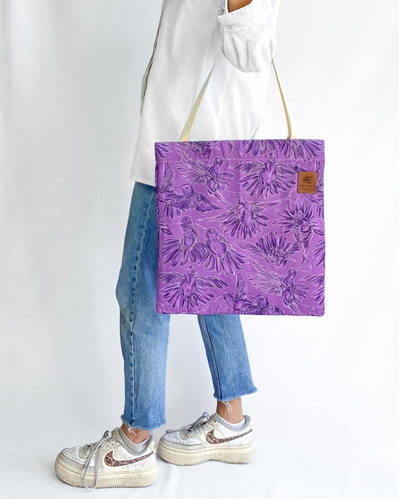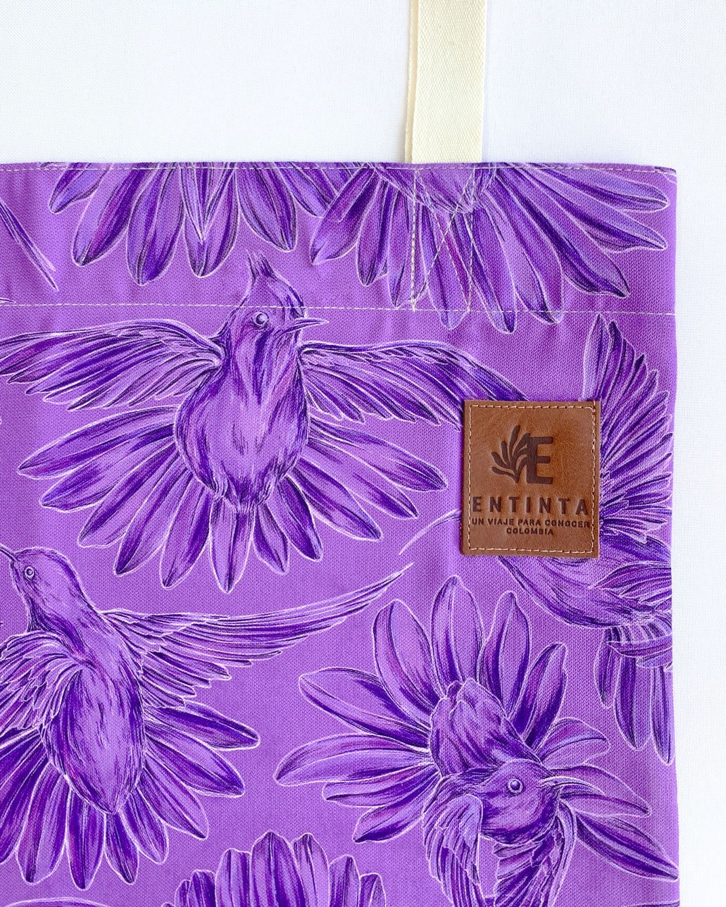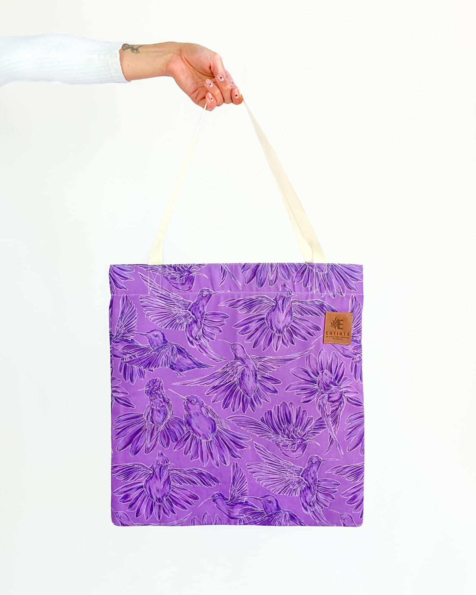 Bolsa de tela con nuestro estampado “Colibríes, mensajeros del mundo natural y espiritual – Con sus alas desplegadas y plumajes vistosos los colibríes vuelan y bailan por La Sierra Nevada. Con sus cantos relatan los secretos de la montaña y propagan los mensajes de la naturaleza, pronosticando las lluvias y sequías, y anunciando los tiempos de siembra y cosecha.”