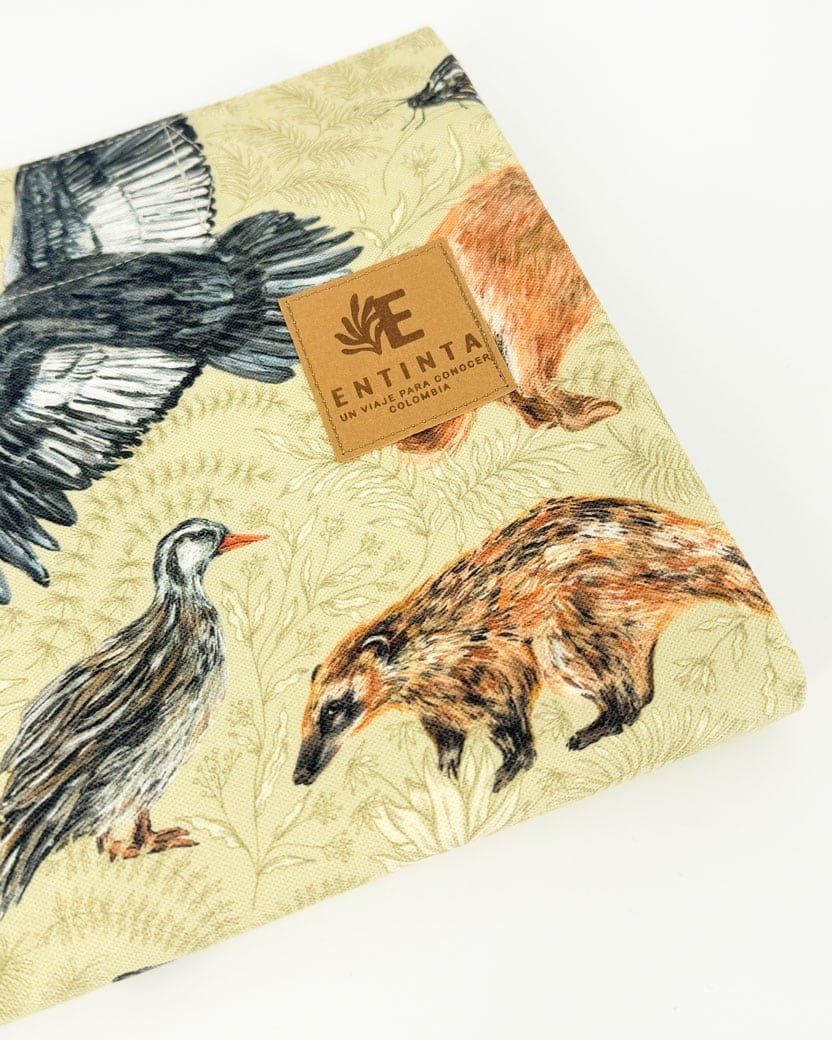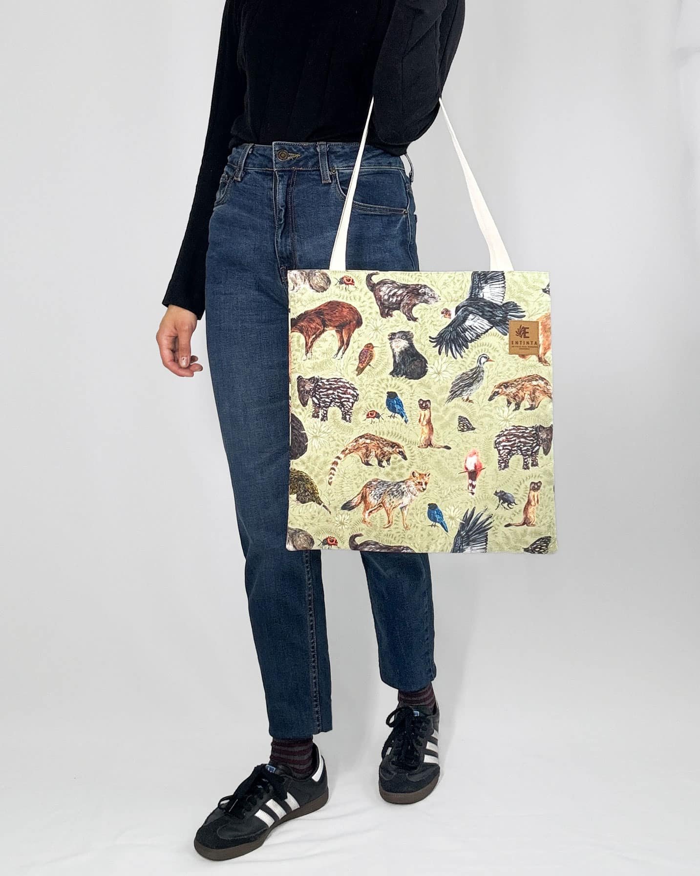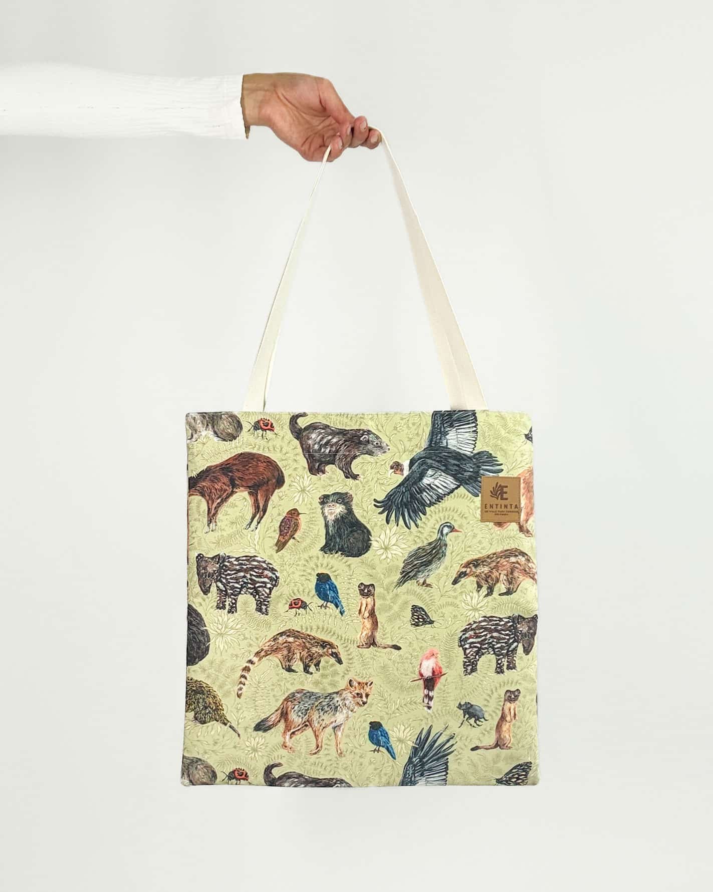 Bolsa de tela con nuestro estampado  Fauna Silvestre en las Montañas de FuegoSeres de la naturaleza que habitan y protegen las montañas de Nariño. Cobijados por la fuerza de la montaña accionan en conjunto por el bienestar de la tierra y la red de vida que conforma el territorio.