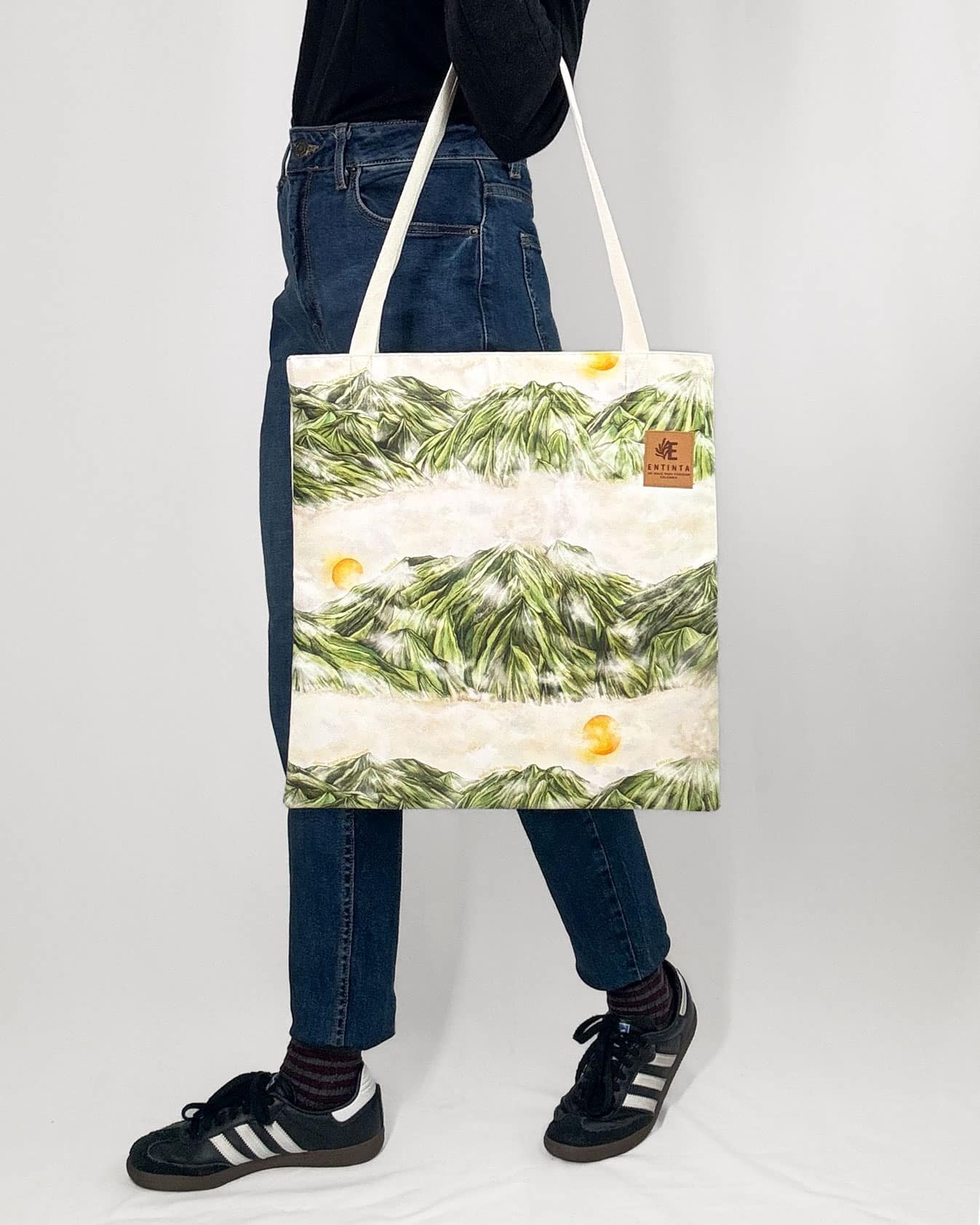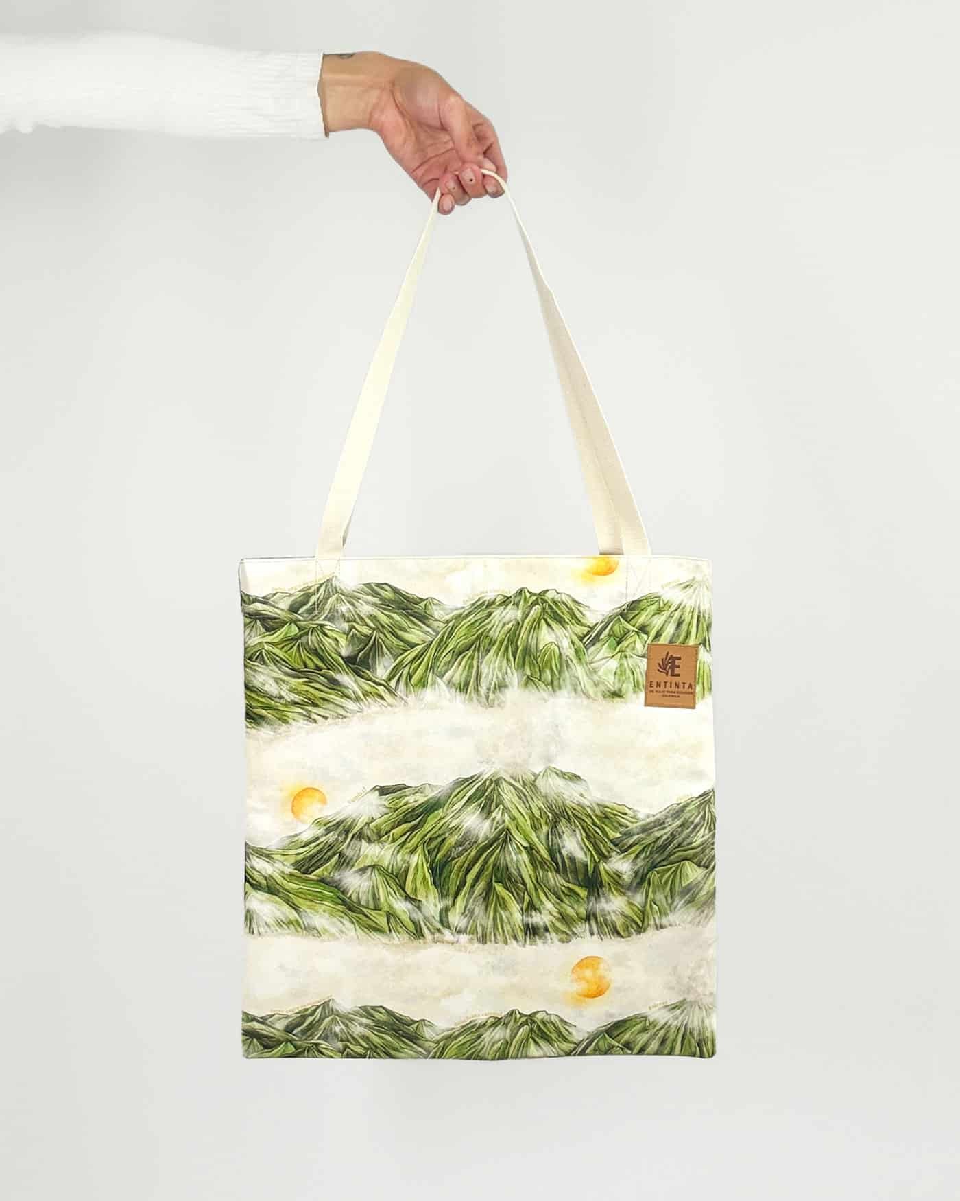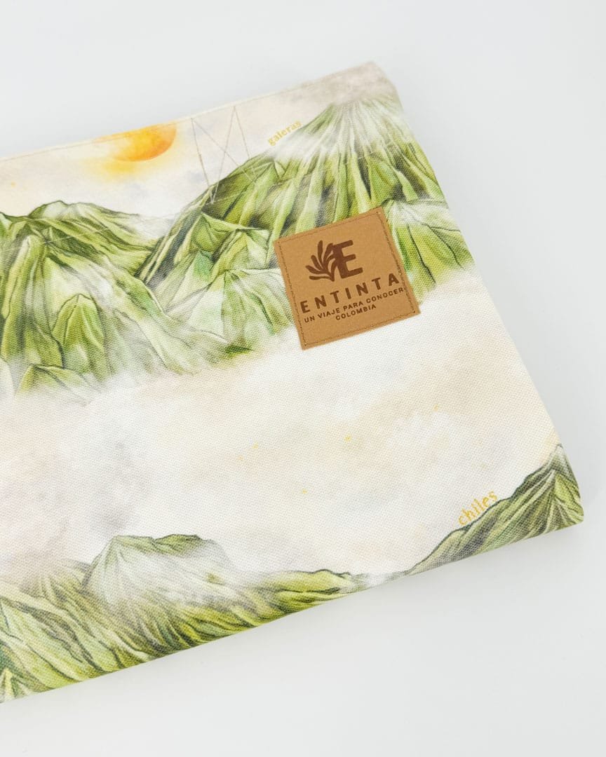 Bolsa de tela con nuestro estampado  La Ruta del Fuego de Nariño La geografía sagrada de Nariño se eleva con la imponencia de sus volcanes, montañas de fuego que ponen en manifiesto la fuerza de la naturaleza. Guardianes milenarios, símbolos de poder y fertilidad, lugar donde el territorio respira liberando su energía a través de cráteres.