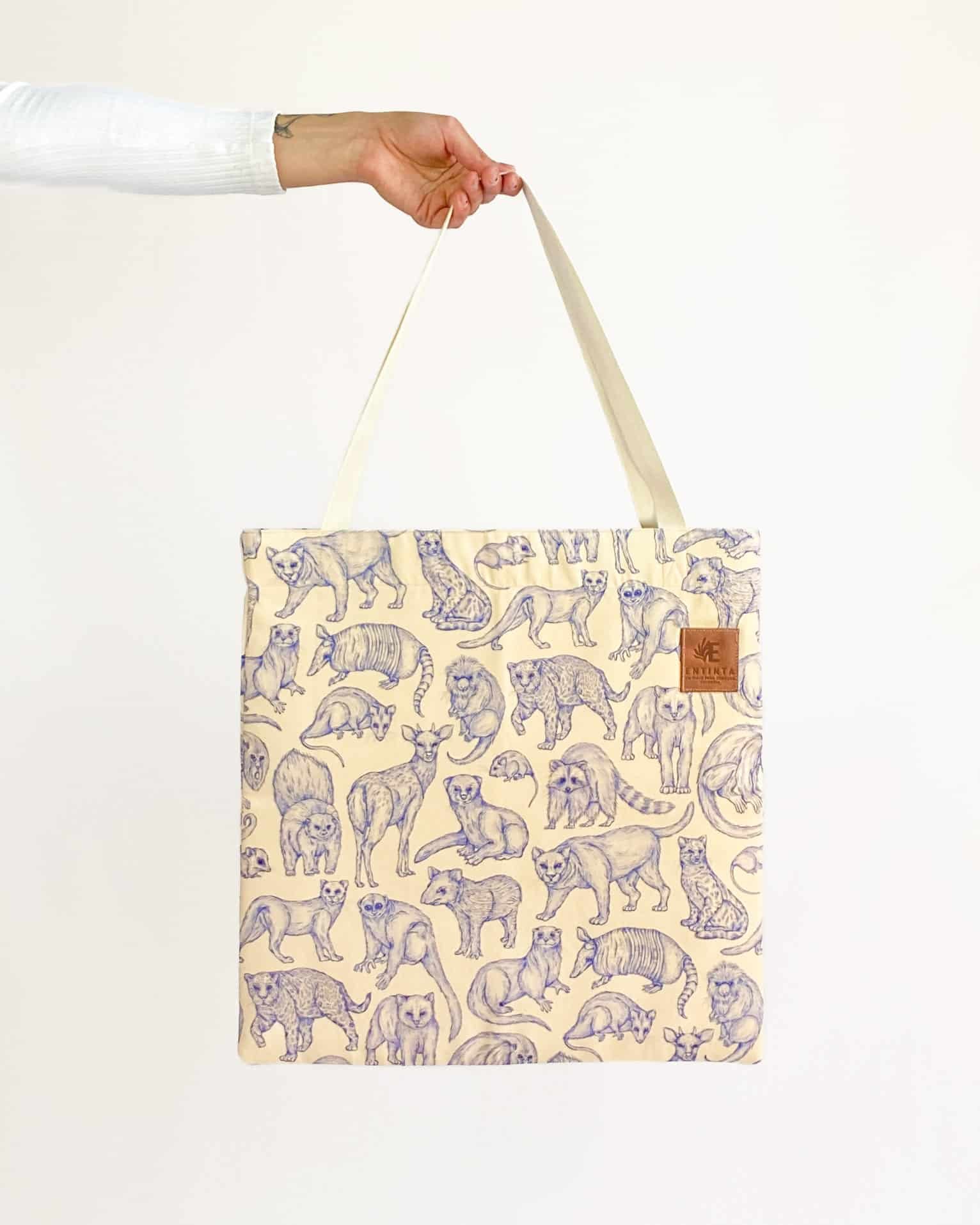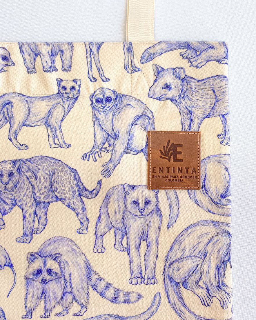 Bolsa de tela Mamíferos de La Sierra, cuidadores de la armonía – Desde los más pequeños hasta los más grandes, los mamíferos de La Sierra son seres vivos y espirituales, autoridades y guardianes del territorio. Protegen y cuidan la conectividad de La Sierra participando en la dinámica natural de los ecosistemas.”.