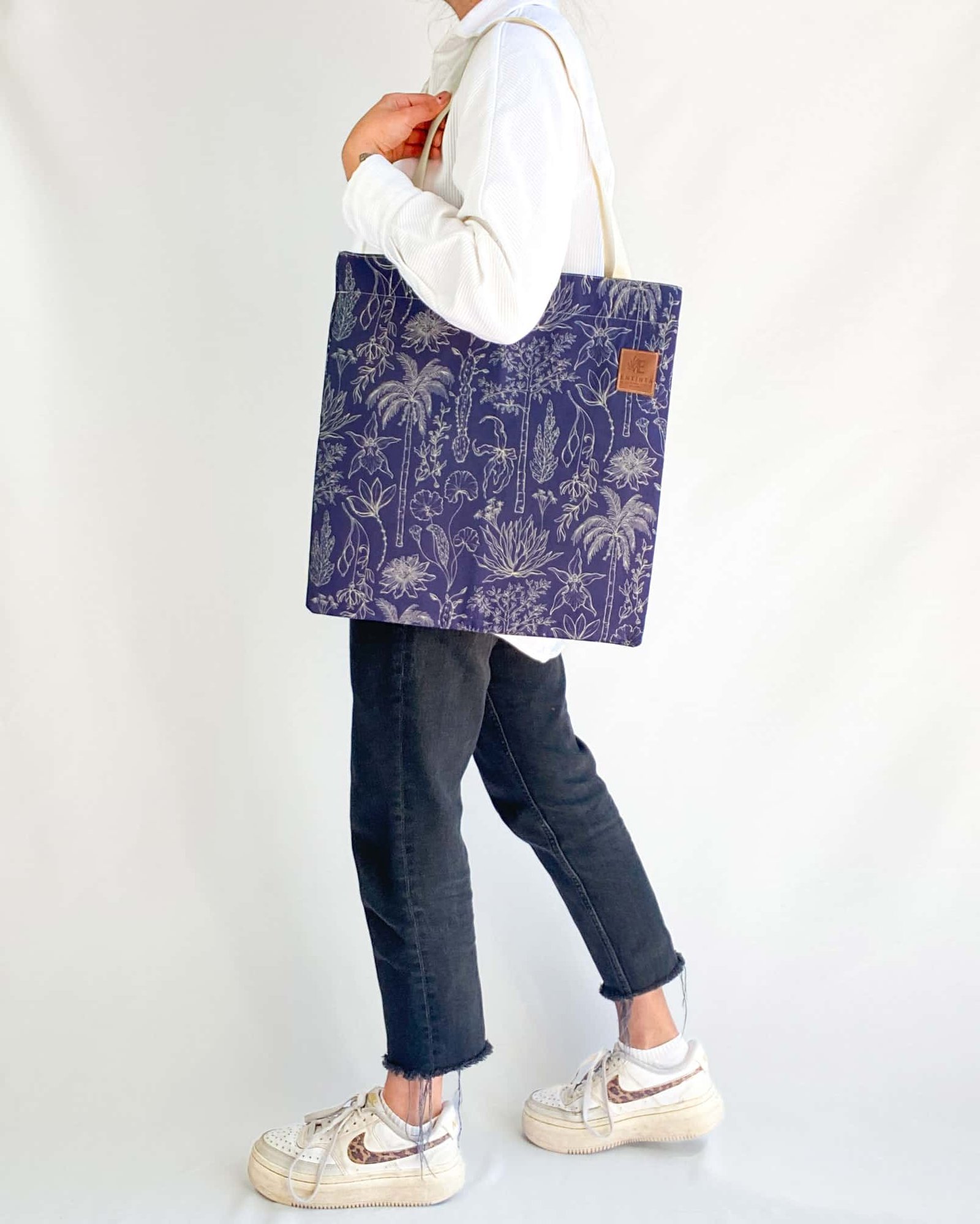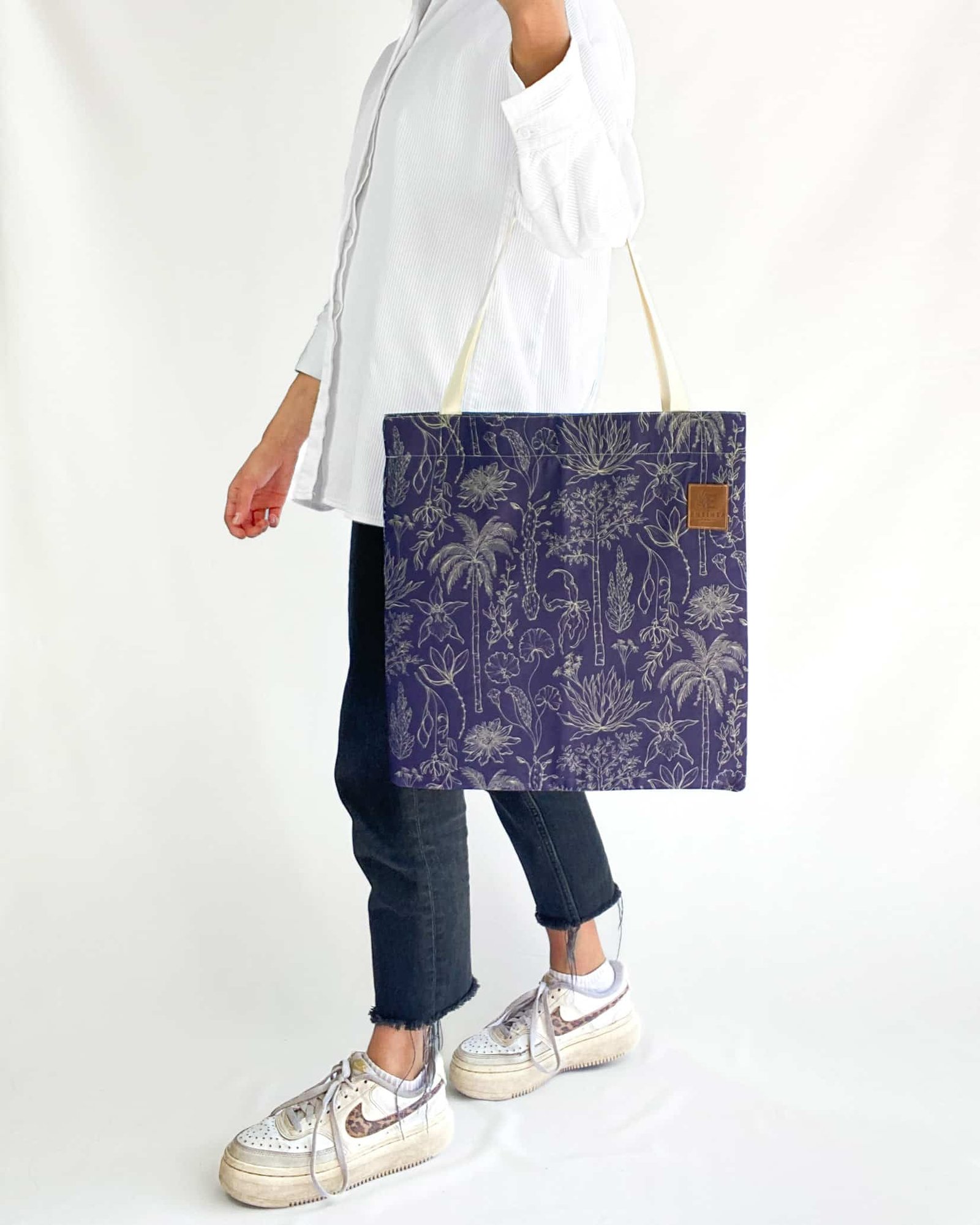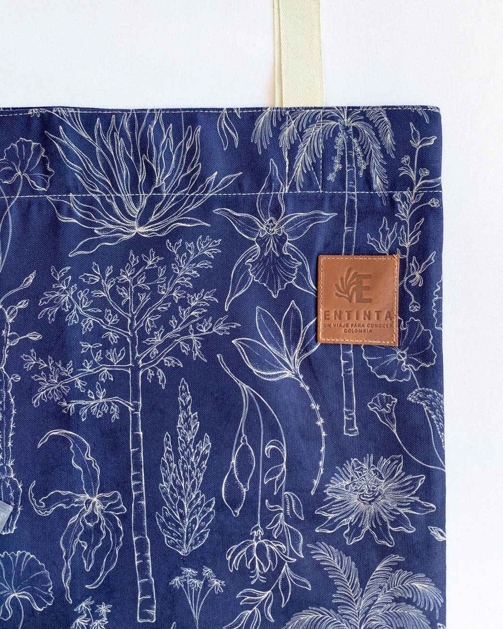 Bolsa de tela con nuestro estampado “Vegetación de La Sierra, heterogénea, relacional y vital – Un panorama de colores, tamaños y formas que cambia cada paso hacia arriba. Desde el mar caribe hasta los picos nevados, a cada planta de La Sierra se le asignó una función ecológica y espiritual que cumplir en el tejido de la vida. Hay plantas medicinales, comestibles, de uso ceremonial, para construir y tinturar.”.